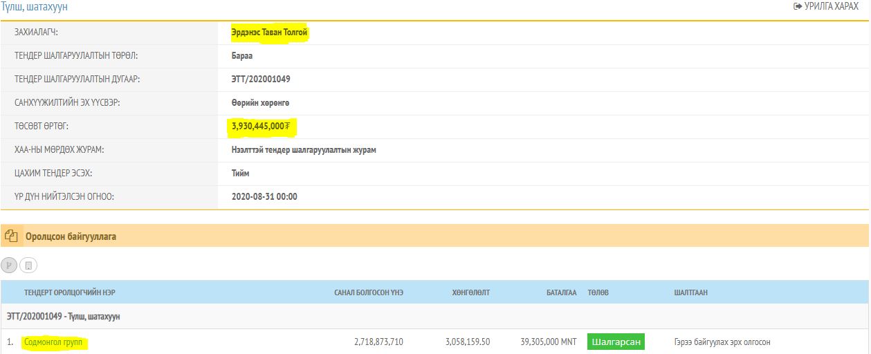 АТГ-аас “Нэр зарласан 17 хүнийг зөвхөн нүүрс хулгайлсан хэргээр биш “Эрдэнэс тавантолгой” ХК-д албан тушаалаа ашиглан бараа материал нийлүүлсэн, гэрээ байгуулахад оролцсон, үйлчилгээ үзүүлсэн хэргээр ч шалгаж байгаа” гэж мэдэгдсэн. Судлаад үзвэл, Ц.Анандбазар “дүрэм”-ийн дагуу “Эрдэнэс тавантолгой” ХК-д шатахуун “шахжээ”. Ингэхдээ зөвхөн “Сод Монгол групп” ХХК-иараа 2018-2020 онд гурван удаагийн гэрээгээр 12 тэрбум төгрөгийн шатахуун “шахсан” баримт байна.