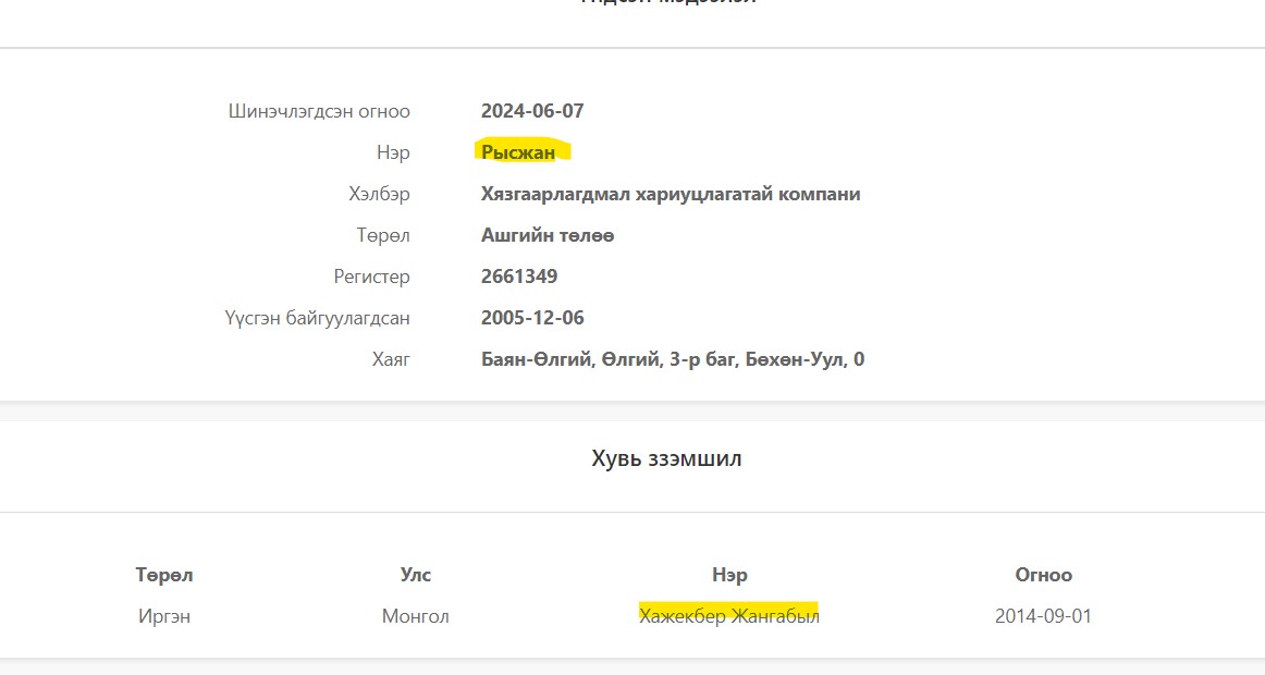 Тэрбээр УИХ-ын гишүүнээр шинээр сонгогдоод буй Х.Жангабылтай халаас нэгтэй улстөрчид гэж хэлж болно. Тодруулбал, Баян-Өлгий аймагт 14 салбараа байгуулсан “Рысжан” ХХК-ийг Х.Жангабыл, Н.Бейбитхан нар анх байгуулсан. “Рысжан” ХХК нь Орос, Казакстанаас шатахуун оруулж ирдэг. Баян-Өлгийн шатахууны бизнесийг “атгасан” гэх тэдний сонгуулийн сурталчилгааны нэг арга нь шатахууны үнийг буулгах гээд хэлчихэд буруудахгүй. Өдгөө тус компанийн гүйцэтгэх захирлаар нь Н.Бейбитханы хүү Б.Жанболат бүртгэлтэй.
