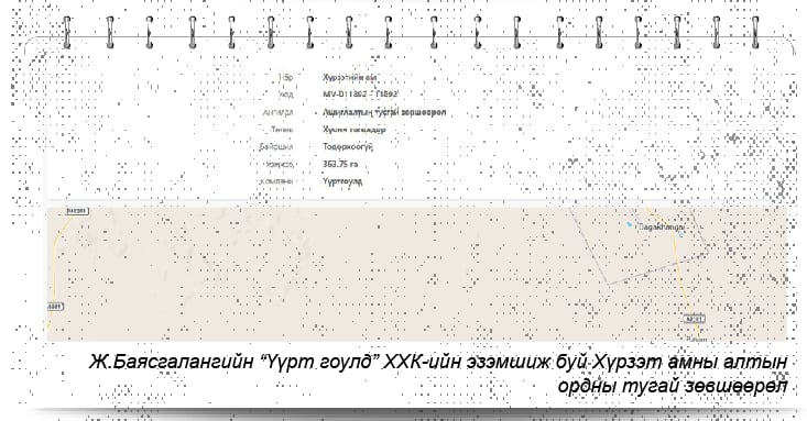 Цаашлаад УИХ-ын гишүүн Ж.Баясгалангийн төрсөн эгч Жадамбаагийн Цолмон “Үүртур” ХХК-ийн эзэмшигч. Аялал жуулчлал, гадаад худалдааны чиглэлээр үйл ажиллагаа явуулдаг гэх бүртгэлтэй ч Төв аймгийн Сэргэлэн сумын Салаагийн орд нэртэй газарт 227 гектар талбайд MV-001865–1865 дугаар бүхий алтны ашиглалтын тусгай зөвшөөрөл эзэмшдэг аж.
