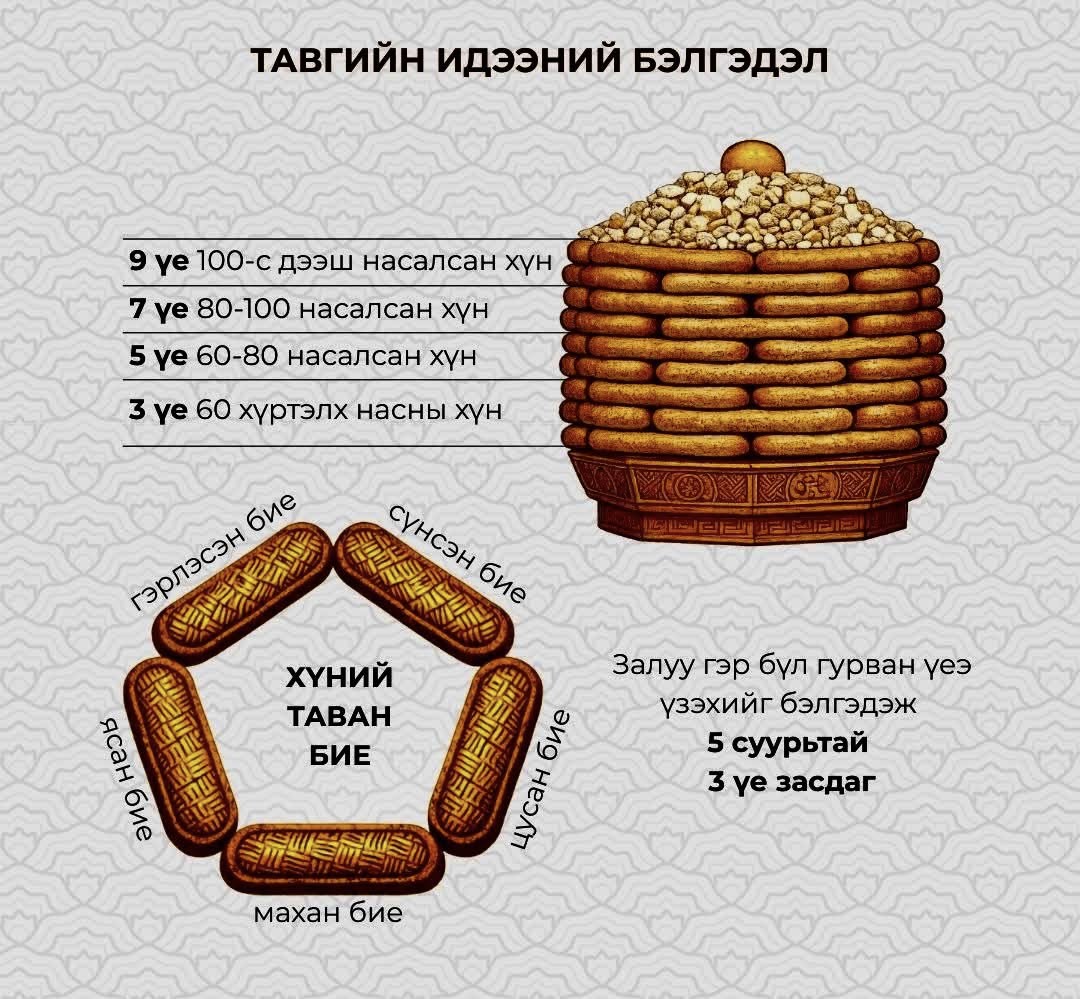 Манай ихэнх нутагт үндсэн тавгийн идээний бяслаг буюу боов хавсайг сондгой тоогоор давхарлан өрдөг. Эцэг, ах нар нь буй айлын тавгийн идээ гурав буюу тав байж болдог. Эцгийнх нь долоон давхар идээ засна. Төрийн шинж чанартай ёслолын тавгийн идээг голчлон есөн давхар засдаг уламжлалтай. Тавгаа өрөм, ааруул, шар, цагаантос зэрэг цагаан идээгээр чимэх ёстой.