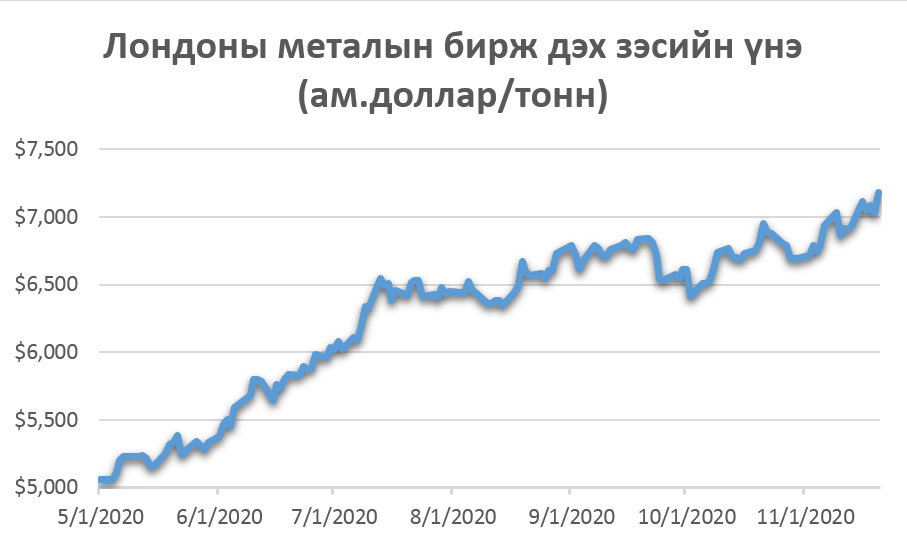 Харин төвбанкнаас өнгөрсөн есдүгээр сард гаргасан Инфляцийн тайландаа “Ирэх 2021 онд гадаад эрэлт сэргэж, зэс, нүүрс, газрын тос зэрэг голлох түүхий эдүүдийн олборлолт нэмэгдэж, Оюутолгойн зэсийн баяжмал дахь металлын агууламж сайжрах нь уул уурхайн салбарын өсөлтөд эерэг нөлөө үзүүлнэ гэж онцолсон. Тэгвэл манай улсын экспортын голлох түүхийн эдийн нэг, аж үйлдвэрийн гол металл болох зэсийн үнэ өнгөрсөн баасан гарагийн байдлаар Лондоны металлын бирж дээр нэг тонн нь 7741 ам.долларт хүрч хаагдав.