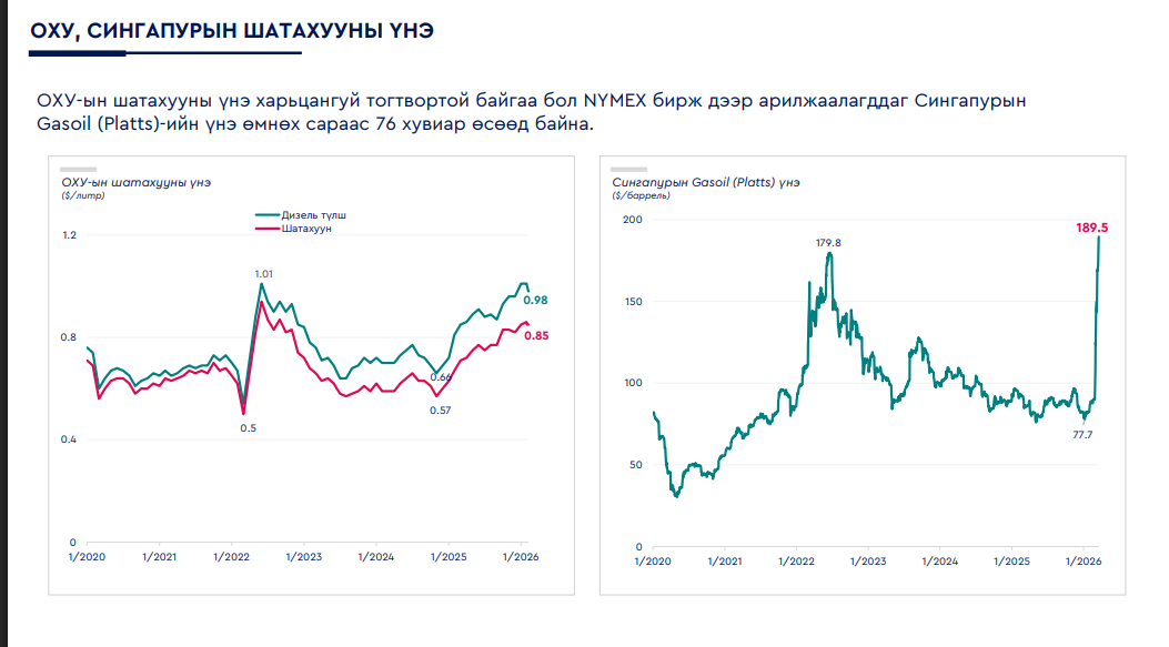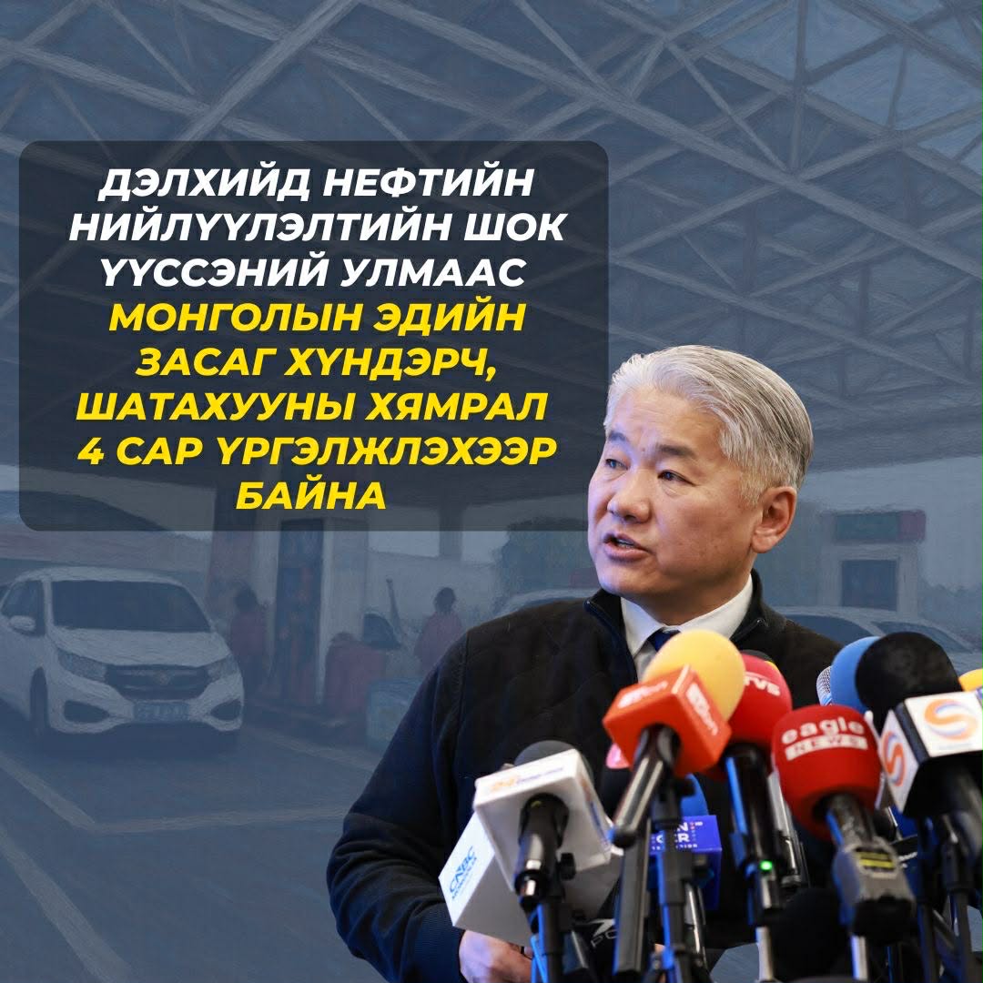 Тэрбээр “Дэлхийд өнөөдөр хямралын мөчлөгт нөхцөл байдал үүсээд байна. Энэ үед улс орнууд дотоод нөхцөл байдалдаа анхаардаг. Ойрхи дорнодын бүс нутагт улс орнууд эрчим хүчний дэд бүтцүүдэд харилцан цохилт өгч эхэллээ. Дэлхийн газрын тосны зах зээлд нийлүүлэлтийн том шок үүсэж эхэлж байна. Боловсруулах үйлдвэрүүд гэмтэл авсан. Дахин сэргэхэд 4-5 жил шаардлага үүсэж байна. Энэ бол бидний онцгой анхаарах асуудал. Өнөөдөр энх тайван тогтлоо гэж үзэхэд дөрвөн сарын хугацаа шаардлагатай. Дунд хугацаандаа шатахууны хомсдолтой холбоотой эдийн засагт үзүүлэх нөлөөлөл өндөр байх нь тодорхой болж байна. Цаашид мөргөлдөөн гүнзгийрсэн тохиолдолд 2026 оныг дуустал үргэлжилнэ. Энэ бол Монгол Улсын төсөв санхүүгийн тогтвортой байдалд нөлөөлөх бодит эрсдэл гэж үзэж байна. Иймд уг нөлөөллийг бууруулах бодлогын арга хэмжээний саналыг Засгийн газрын хуралдаанд танилцуулахаар болж байна. Олон улсын эдийн засагт Ормузын хоолойн нийлүүлэлт саатсаны улмаас газрын тос, байгалийн хийн үнэ хоёр дахин өсөөд байна. Энэ нь дэлхийн эдийн засагт томоохон доргилт үүсгэж эхэллээ. Монгол Улсын эдийн засаг, худалдаа өмнөд хөрштэй нягт хамааралтай. Бид БНХАУ-ын эдийн засагт үзүүлэх нөлөөг анхааралтай ажиглаж байдаг. Шатахуун талаасаа суурь үнэ, инфляц өсөх төлөв үүслээ. Ойрхи Дорнодын бүс нутгийн нөлөө БНХАУ-ын эдийн засагт өндөр байгаа учраас тус улсаар дамжин Монголд нөлөөлөх өндөр магадлалтай. Шатахууны үнийн хувьд Монгол Улс ОХУ-тай шууд хамааралтай. Хоёр улсын худалдаанд шатахууны үнэ тогтвортой байна. Монгол Улсад нийлүүлэлт талаасаа хүндрэл гарахгүй. Шатахууны нийлүүлэлт тогтвортой байна. ОХУ-тай АИ-92 төрлийн шатахууны үнийг тогтворжуулалтын гэрээтэй. Дизель түлшний Сингапурын биржийн жишиг үнээр явдаг. Өнөөдрийн байдлаар Сингапурын биржийн жишиг үнэ өсөлттэй байна. Гэхдээ бид Сингапурын биржийн үнэ гурван сар дараалан өсөлттэй гарсан тохиолдолд үнэ шинэчлэх гэрээтэй. Үндсэндээ хоёр тал ирэх долдугаар сарын 1-н гэхэд үнийн асуудлаар хэлцэл хийх магадлалтай. Үнийн өсөлт үргэлжилсэн тохиолдолд хэлцэлд орно. Ойрхи Дорнодын хурцадмал байдал намжиж, үнэ буурсан тохиолдолд тогтвортой байдлаа хангаад явах бололцоотой. Бидний гол асуудал дизель түлшний үнэ. Газрын тосны үнэ 20 хувиар өссөн тохиолдолд манай эдийн засаг нэг хувийн инфляц үүсэх тооцоо гарсан. Дотоодын шатахууны биет нөөц хангалттай байгаа. Нөгөө талаар хүнсний үнийн өсөлтийг анхааралтай ажиглаж байна. Дэлхийн хүнсний индексүүд тогтвортой байна. Хятад, Орост шатахууны үнэ өссөн тохиолдолд импортоор дамжин Монголд нөлөөлөх магадлалтай. Хүнсний дотоод нөөц тогтвортой байгаа. Цаашдаа санхүү төсвийн болзошгүй эрсдэлээс сэргийлж, яаралтай авах арга хэмжээнүүдийг Засгийн газраас хэлэлцүүлнэ. Дэлхийд нефтийн нийлүүлэлтийн шок үүссэн. Улмаар шатахууны хямрал багадаа дөрвөн сар үргэлжилж, манай улсын эдийн засагт хүндрэл үүсэх төлөвтэй байна. Маргааш ЗГ-ын хуралдаанаар хэлэлцэнэ. Шатахууны үнэ 14 хувиар өсвөл үнийн өсөлт 12.7 хувь, инфляц 0.7 хувиар нэмэгдэх тооцоо гарсан” гэлээ.