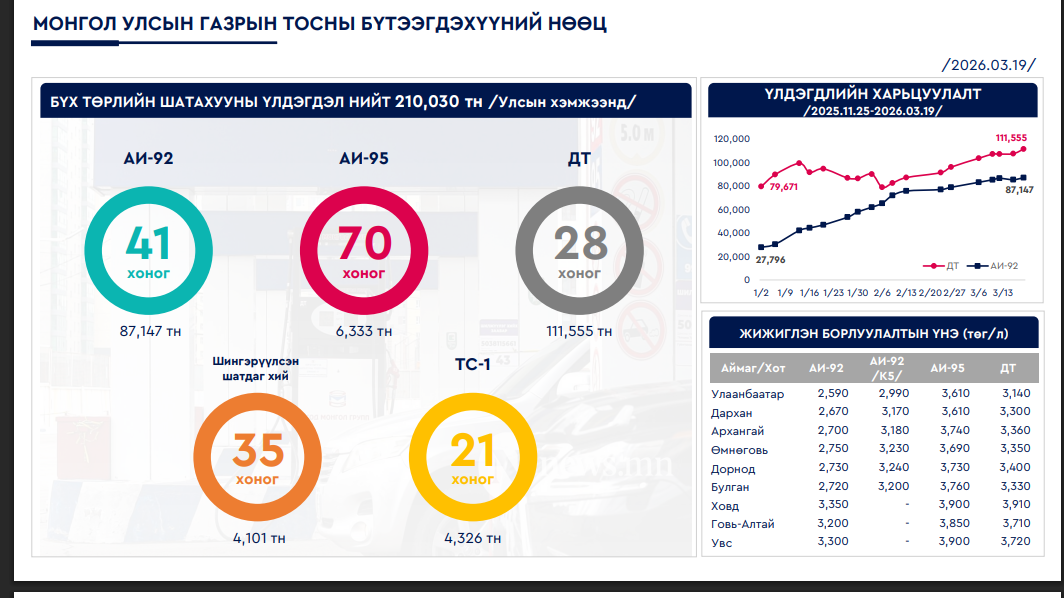 Үүнийг дагаад манай улсад шатахууны үнэ өсөх эрсдэл үүсээд буй. Эдийн засаг, хөгжлийн яамнаас өчигдрийн байдлаар манай улсад бүх шатахууны үлдэгдэл нийт 201030 тонн гэж мэдэгдсэн. Тодруулбал, АИ-92 41 хоног, АИ-95 70 хоног, ДТ 28 хоног, шингэрүүлсэн шатдаг хий 35 хоног, ТС 21 хоногийн нөөцтэй байгаа. Энэ нь хангалттай нөөц бөгөөд энэ нөөц дээрээ үндэслэн шатахууны үүнийг хамгийн ихдээ 300 төгрөгөөр нэмнэ. Цаашдаа цаг үеийн нөхцөл байдалтай уялдуулна гэсэн. Гэвч шатахуун нийлүүлэлт багасах сургаар импортлогчид зохиомол эрэлт үүсгэж байна.