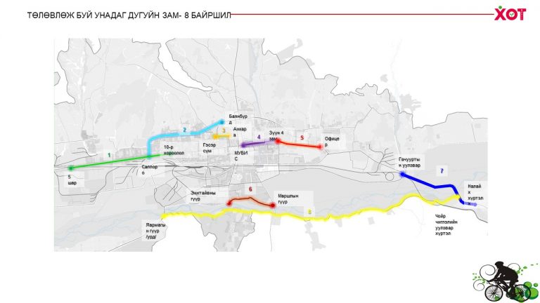 Түүнчлэн 2016 онд зохион байгуулагдсан АСЕМ–ын арга хэмжээний үеэр хотын төвийн хэсгээр дугуйн замууд тавигдаж эхэлсэн нь ногоон өнгөөр ялган будсан зам юм. Хожим өнөөх ногоон будаг нь халцарч, булан тохой нь эмтэрч, өвөлдөө халтиргаа үүсч “бүтэл муу”-тай ажил болсон. Ингээд цаашид баригдах дугуйн замыг асфальтаар хийж гүйцэтгэхийг тухайн үеийн хотын мээр 2018 онд холбогдох газруудад үүрэг болгож байв. Энэ тухай Нийслэлийн Хот төлөвлөлт, ерөнхий төлөвлөгөөний газрын Хот төлөвлөлтийн хэлтсийн ахлах мэргэжилтэн Д.Хан-Уул “Энэ жилээс эхлэн тавигдах дугуйн замууд дэлхийн стандартад нийцсэн насжилт өндөр, өнгө үзэмж сайтай баригдах болно” хэмээн 2018 онд ам гарч байлаа.