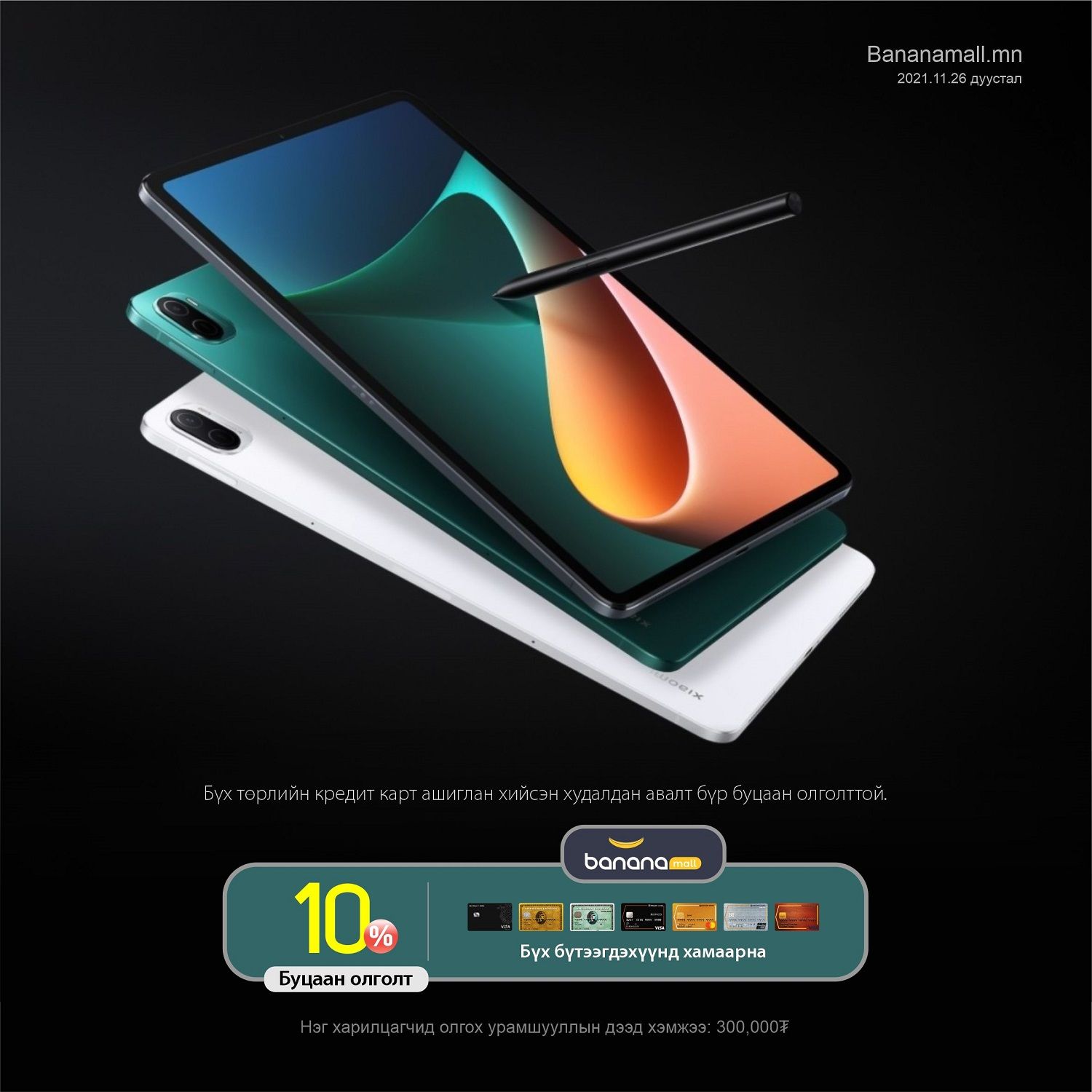 Голомт банкны SocialPay аппликэйшн болон Bananamall.mn хамтран 10%-ийн хөнгөлөлттэй урамшууллыг зарлаж байсан. Харин энэхүү урамшуулал Голомт банкны бүх төрлийн кредит картаар үргэлжилж байна. Харилцагч та тус онлайн худалдааны вэбсайтаас хийсэн бүх төрлийн кредит картын худалдан авалт бүрд 10%-ийн буцаан олголт авах боломжтой боллоо.