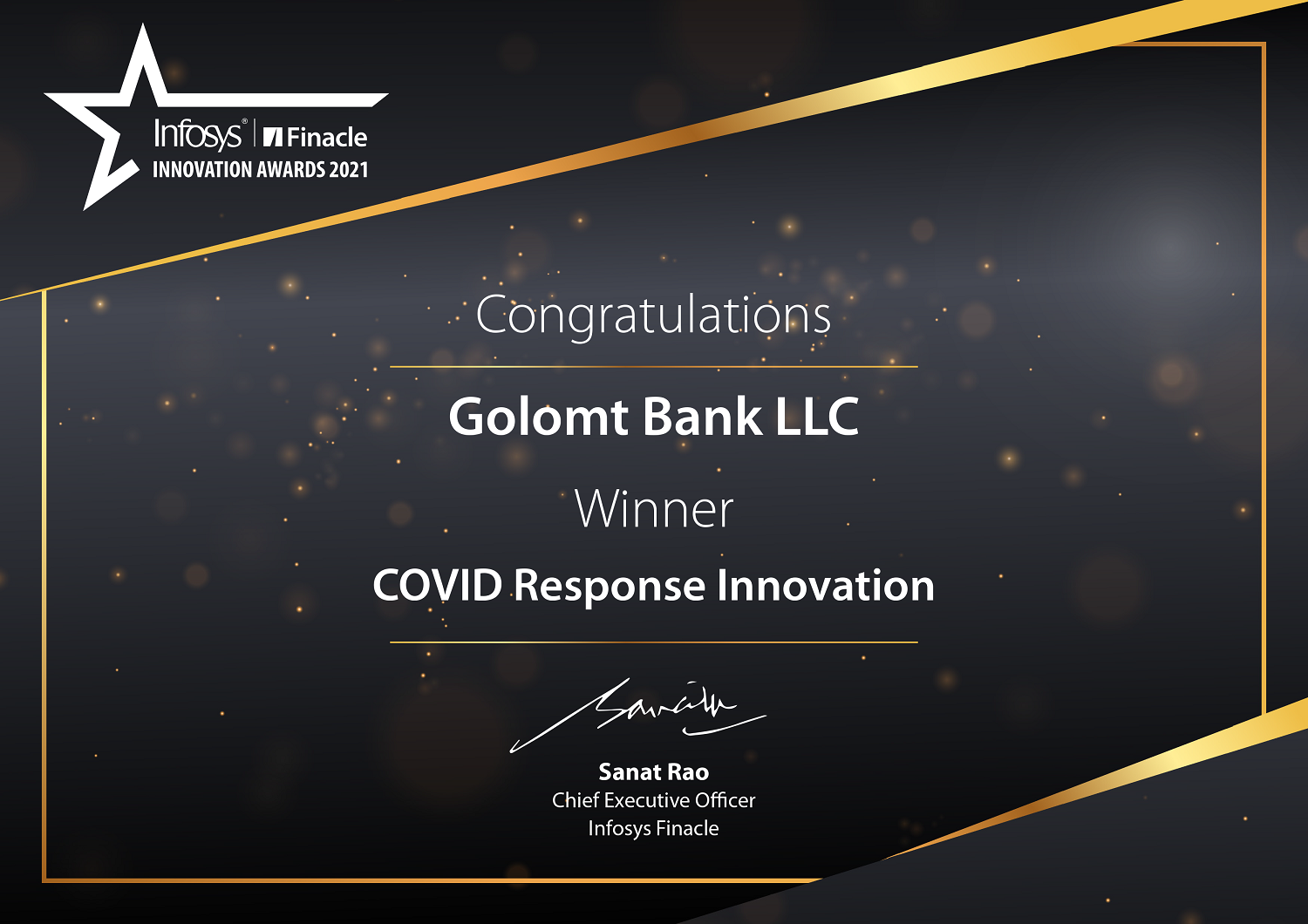 Хиймэл оюун ухаан, програм хангамжийн нийлүүлэлт, үйлчилгээгээр дэлхийд тэргүүлэгч Infosys Finacle компаниас жил бүр зохион байгуулдаг “Infosys Finacle Innovation Awards-2021” арга хэмжээнд Голомт банкийг “COVID Response Innovation” төрөлд SocialPay дижитал хэтэвч болон Робот процесс автоматжуулалтын (RPA) системүүдийг үндэслэн шилдгээр шалгаруулжээ. Долоо дахь жилдээ зохиогдож буй тус арга хэмжээнд дэлхийн 50 гаруй орны банк, санхүүгийн байгууллагууд нэр дэвшин өрсөлдсөнөөр Голомт банк ийнхүү гурав дахь жилдээ тодорлоо.