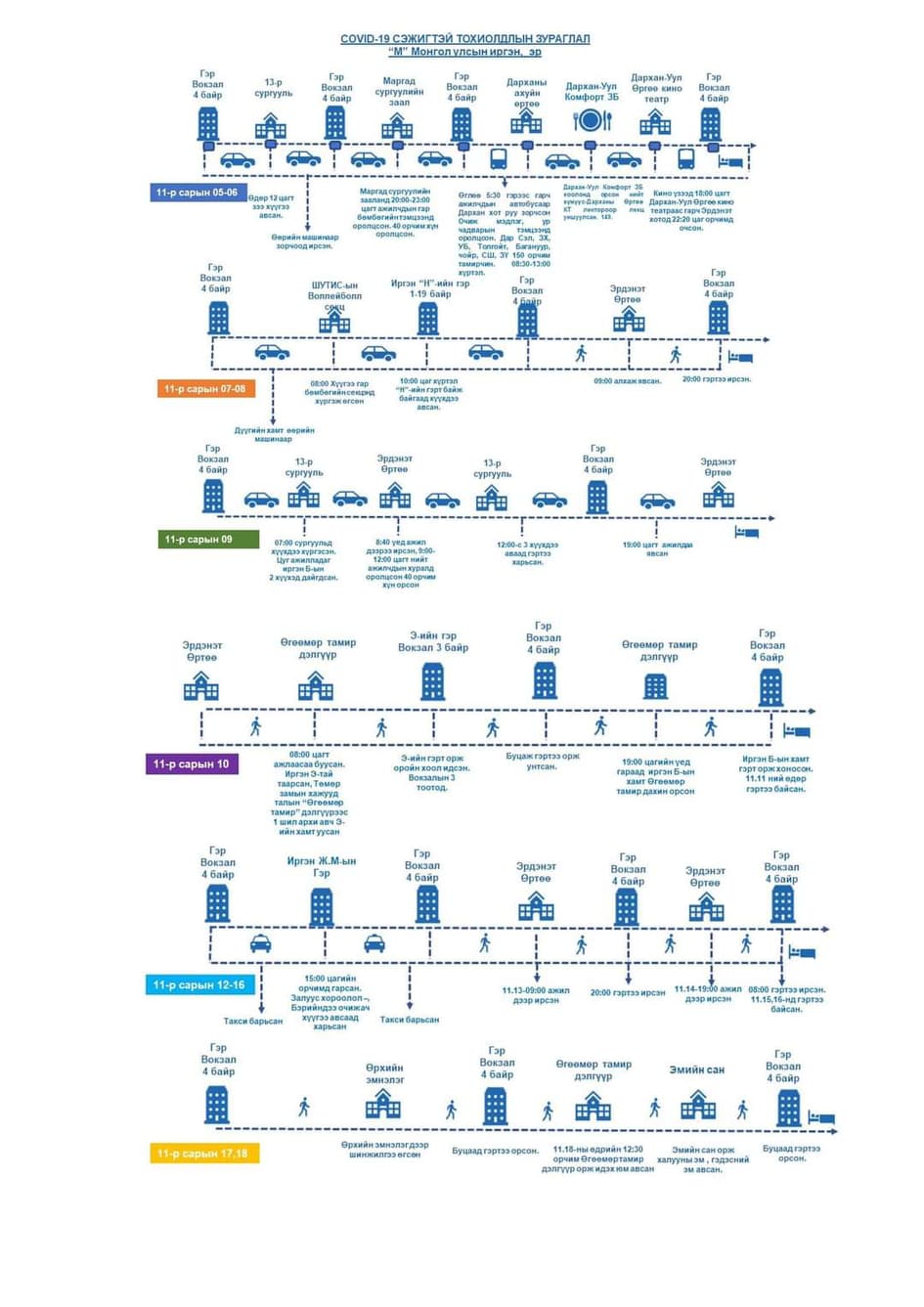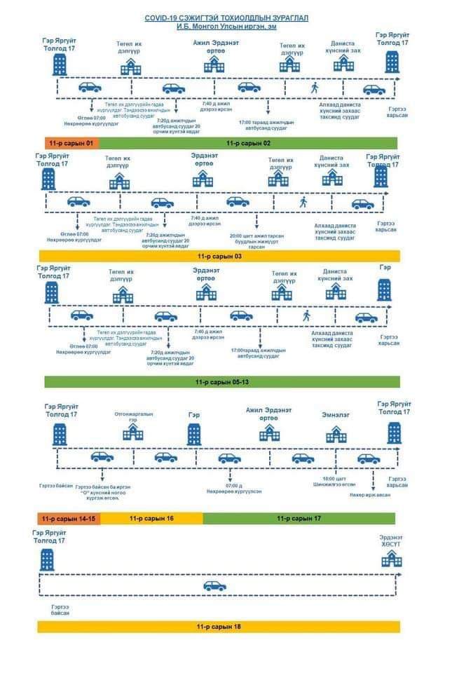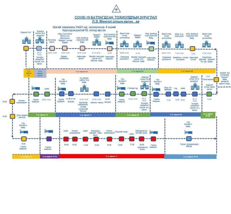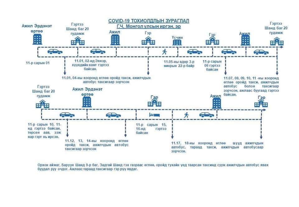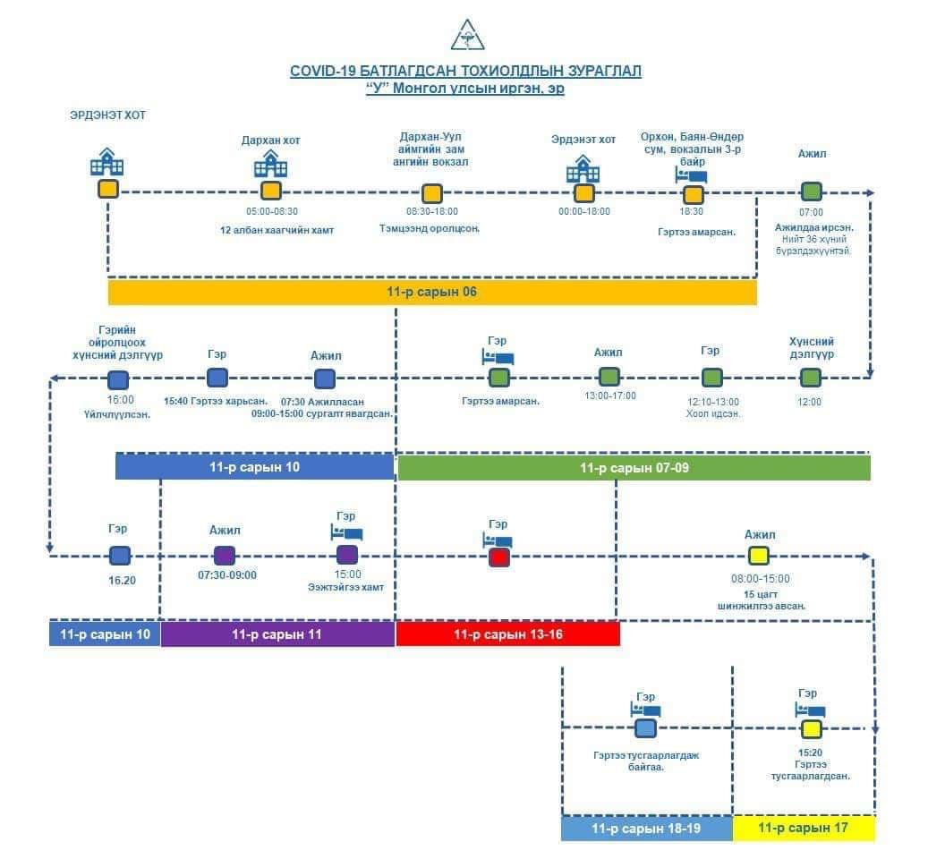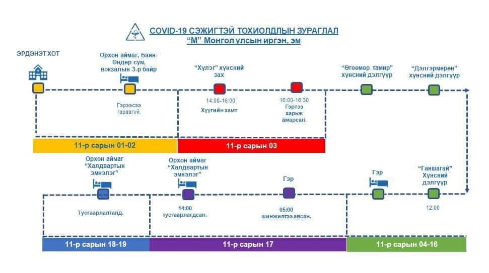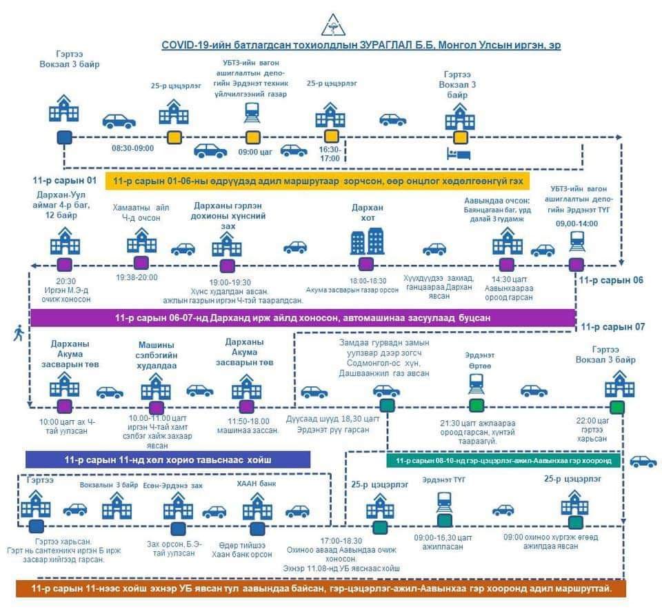 Манай улсад коранавирусийн халдвар авсан иргэдийн тоо 557 хүрч, дотооддоо алдсан нь 122 болсон. дотооддоо халдварласан багц өвчлөл нь Улаанбаатар хотын голомт төмөр зам дагуух голомт гэх хоёр эх үүсвэртэйг Эрүүл мэндийн яамнаас мэдээллээд байна. Үүнээс Орхон аймагт 13 тохиолдол бүртгэгдээд буй. Тэгвэл эдгээр иргэний маршрутыг гаргажээ.