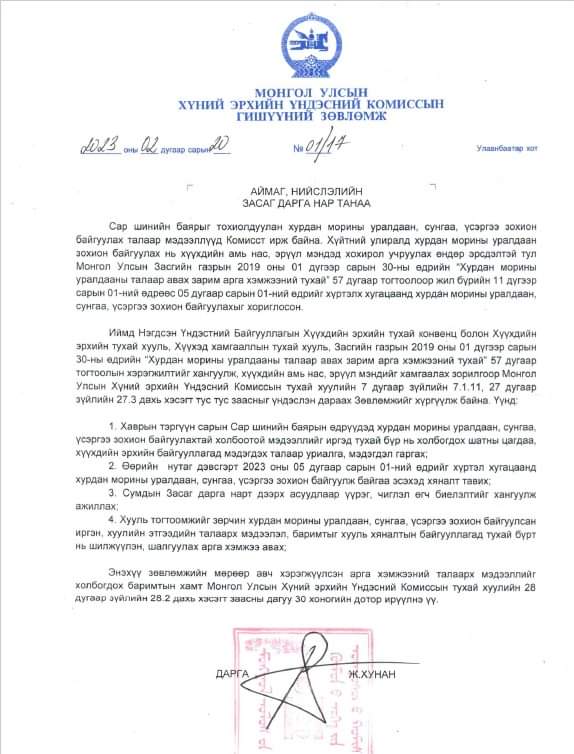 Сар шинийн баярын өдрүүдэд хурдан морины уралдаан, сунгаа, үсэргээ зохион байгуулах тухай мэдээлэл Хүний эрхийн үндэсний комисст ирж байгаа учир нийслэл болон 21 аймгийн удирдлагуудад ХЭҮК-оос зөвлөмж хүргүүлжээ.