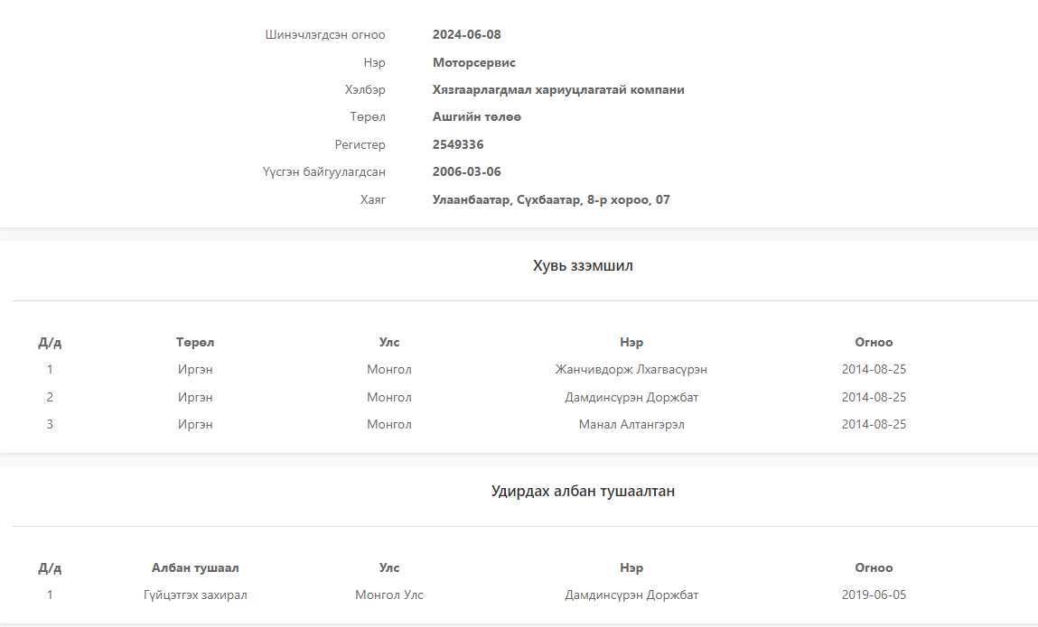 “Мотор сервис “ компанийг судалж үзвэл, 2006 оны гуравдугаар сарын 6-нд үүсгэн байгуулагдсан. Анх Гадаад худалдаа, автозамын чиглэлээр үйл ажиллагаа явуулахаар Улаанбаатар, Сүхбаатар дүүргийн наймдугаар хороо, 07 тоот хаяг дээр бүртгүүлж байжээ. Харин 2014 онд Авто замын 2.8.1, 2.8.3, 2.8.4, 2.8.5, 2.8.7 дах заалтын дагуу үйл ажиллагаагаа өргөжүүлсэн байна. Хувьцаа эзэмшигчээр нь, Жанчивдорж Лхагвасүрэн, Дамдинсүрэн Доржбат, Манал Алтангэрэл нар бүртгэлтэй байна. Харин гүйцэтгэх захирлаар нь Дамдинсүрэнгийн Доржбат 2019 оноос ажиллаж байгаа аж.