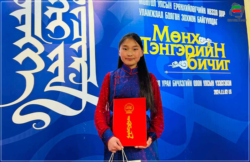 "Мөнх тэнгэрийн бичиг” уран бичлэгийн уралдаанд 8-10 дугаар ангийн сурагчдын ангилалд Хөвсгөл аймгийн Рэнчинлхүмбэ сумын наймдугаар ангийн сурагч Г.Туяацэцэг тэргүүн байр эзэлсэн билээ. Хулсан үзгээр хичээллээд гурван жил болж байгаа түүнтэй ярилцлаа.