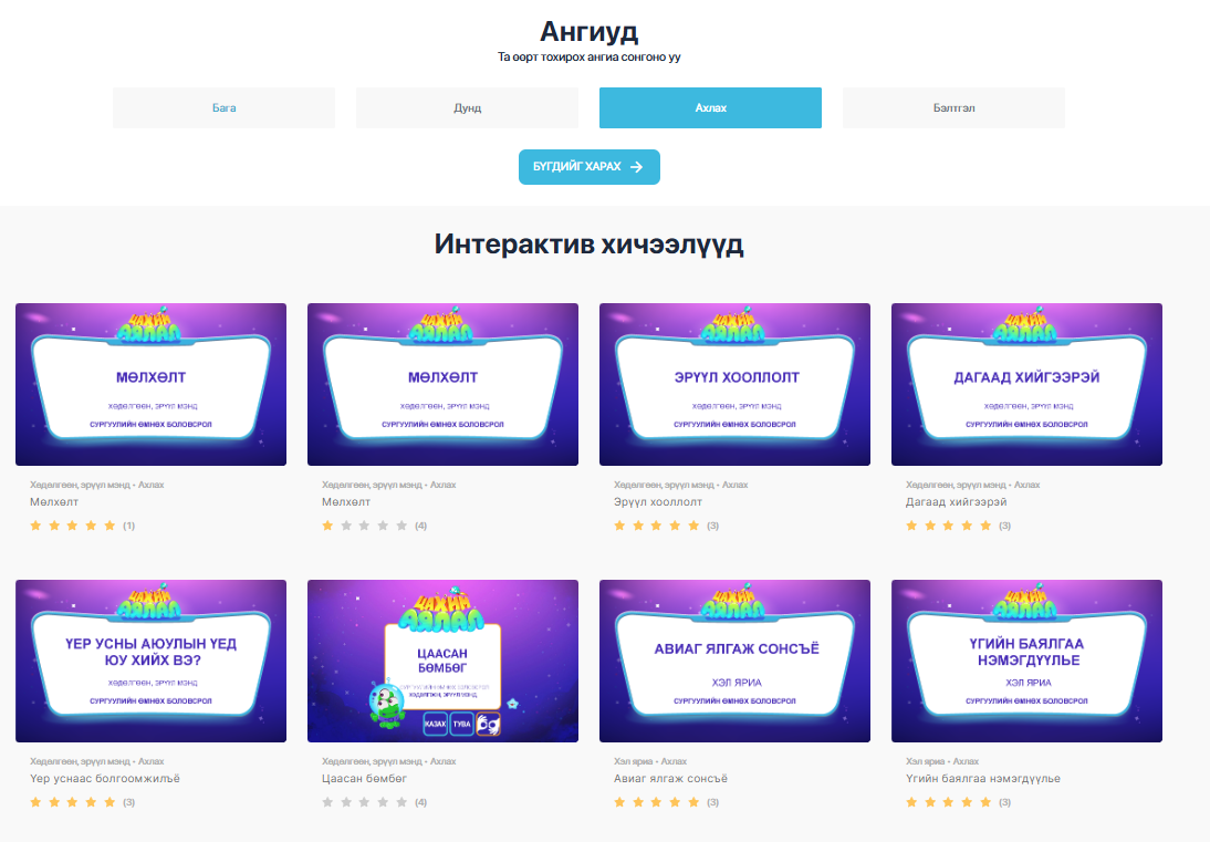 Интерактив хичээлүүд үзэх бол: https://medle.mn/interactiveAll/2/0 хэсгээс танилцах боломжтой.