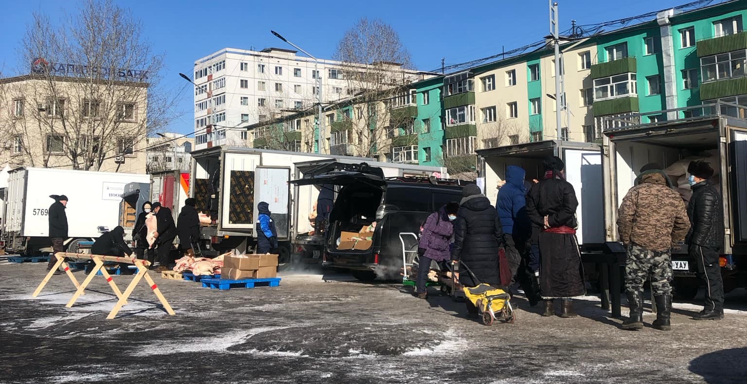 Энд, тэндгүй эгнэж зогссон мах ачсан машины худалдагчдаас “Үхрийн мах хэд вэ. Хонь байгаа юм уу, үнэ нь хэд вэ” гэж чанга дуугаар асуух иргэдийн цуваа үргэлжилнэ. Хэдийгээр батганы хошуу багтах зайгүй шахам хүн зоны бөөгнөрөл байхгүй ч махны худалдааг зорьж ирэх иргэн олон байгааг худалдагчид ярьж байна.