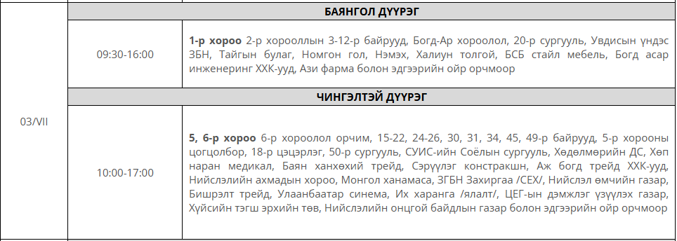 Өнөөдөр буюу долоодугаар сарын 3-ны пүрэв гарагт цахилгаан хязгаарлаж, засвар үйлчилгээ хийх хуваарийг танилцуулж байна.
