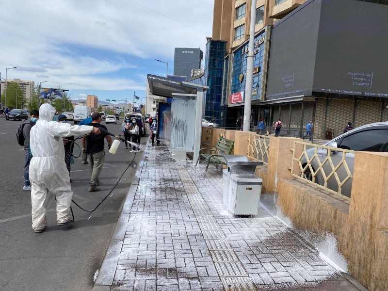 Улаанбаатар хотын Захирагчийн ажлын алба ариутгал халдваргүйжүүлэлт хийх тусгай зөвшөөрөлтэй 37 аж ахуйн байгууллагатай хамтран нийтийн гудамж талбай, автобусны буудал, олон нийт цуглардаг үйлчилгээний байгууллагууд болон гэр хорооллын модон жорлонд халдваргүйжүүлэлт хийж байна. Мөн нийтийн эзэмшлийн гудамж талбайд байрладаг сандал, хогийн сав, автобусны буудал зэргийг зориулалтын халдваргүйжүүлэлтийн бодис, хөөсөөр угааж цэвэрлэж байгаа юм. Өнөөдрийн байдлаар Чингисийн өргөн чөлөө, Энхтайваны өргөн чөлөө, Бага тойруу, Их сургуулийн гудамжинд байрлах 26 автобусны буудал, иргэд амралт чөлөөт цагаа өнгөрүүлдэг гурван талбайг угааж, цэвэрлэжээ.