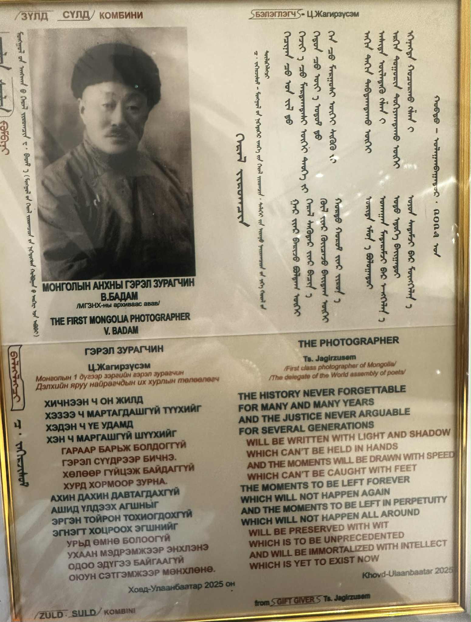 -Би ээжийнхээ зургийг авч өгч амжаагүй. Уг нь би зургийг нь авч өгнө өө л гэдэг байсан юм. Харамсалтай нь авч амжаагүй байтал ээж минь бурхан болчихсон. Аливаа зүйлийг хойшуулдаг нь их буруу юм билээ. Харин аавынха зургийг авч өгснөөр аав минь гэрэл зурагт мөнхөрсөн дөө.