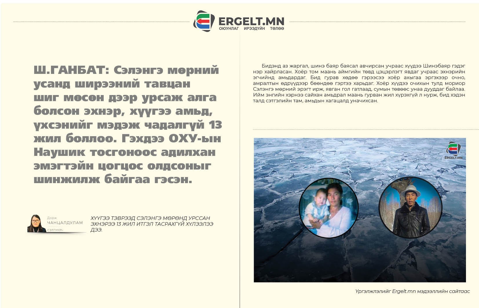 Үхэл, амьдралтай зургаан цаг голын мөсөн дотор тэмцэж, сураггүй болтлоо аврал эрж, алгын чинээхэн мөсөн дээрээс эцсээ хүртэл хүүгийнхээ төлөө амь гуйсан Н.Саранчимэг, түүний хүү Г.Шинэбаяр нарын сураг гаралгүй 13 жил өнгөрч, ар гэрийнхэн нь амьдын хагацалд байна. Бид тухайн үед юу болсон талаар Н.Саранчимэгийн нөхөр Ш.Ганбаттай хөөрөлдсөн яриагаа уншигч танд хүргэхээр зэхлээ. Ш.Ганбатын хувьд Сэлэнгэ аймгийн Бугант тосгонд амьдардаг. Хэдийгээр тэр хэдхэн жилийн өмнө өөр амьдрал зохиосон ч, эхнэр, хүүхдээ харуулдаж, сургийг нь гаргах гэж олон жилийг ард үджээ. Тэрбээр ийн ярилаа.