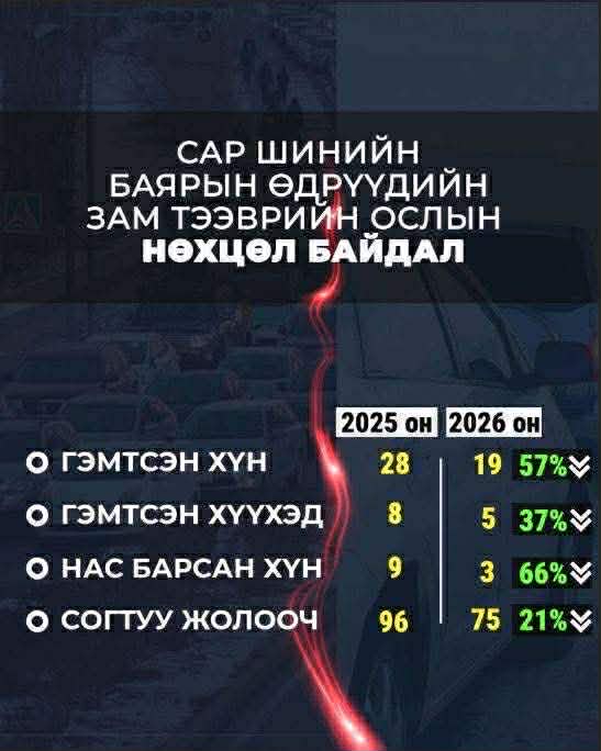 Энэ төрлийн хэрэг сар шинийн битүүний өдрөөс хойш гэхэд 51 бүртгэгджээ. Ихэнх нь архи, согтууруулах ундаа хэрэглэснээс үүдсэн байна. Гудамжинд архи ууж, дайвсан хүн илт харагдахгүй байгаа ч ахуйн хүрээнд архи ууж, нэгнээ бэртээж, баярын амралтыг тааруулж удаан уулзаагүй найз нөхөдтэйгээ уулзах гэхчлэн дарвиснаас болж энэ төрлийн гэмт хэргийн тоо өсдөг байна. Архи ер олон гэмт хэргийн гол үүсгэгч. Согтуугаар жолоо барьж осолдож байгаа хүмүүс л гэхэд сануулсаар байтал машинаа бариад зам дээр гарснаар энэ төрлийн зөрчил ихээр үүсэж, нөгөө талаар хайран сайхан амиа алдаж байна. Тэгээд мөн хол замд хурдаа нэмж, гэрлээ шилжүүлэхгүй явна. Анхааруулсаар байтал ухаан жолоогүй давхичихна. Мөс цөмрөх аюултай нуур дээгүүр гарах гэж яваад эндэнэ. Энэ бүхнээс л үүдэж эцэстээ амь, амьдралаа алдсан харамсалтай хэргүүд гарсаар байна. Хамгийн сүүлийн жишээ гэхэд Буйр нуурт дөрвөн хүн амь эрсэдсэн харамсалтай мэдээ гарсан. Тэгэхээр ерөөс бидний үргэлж сэрэмжтэй байх, өөрсдөөс шалтгаалах хэргүүд энэ.