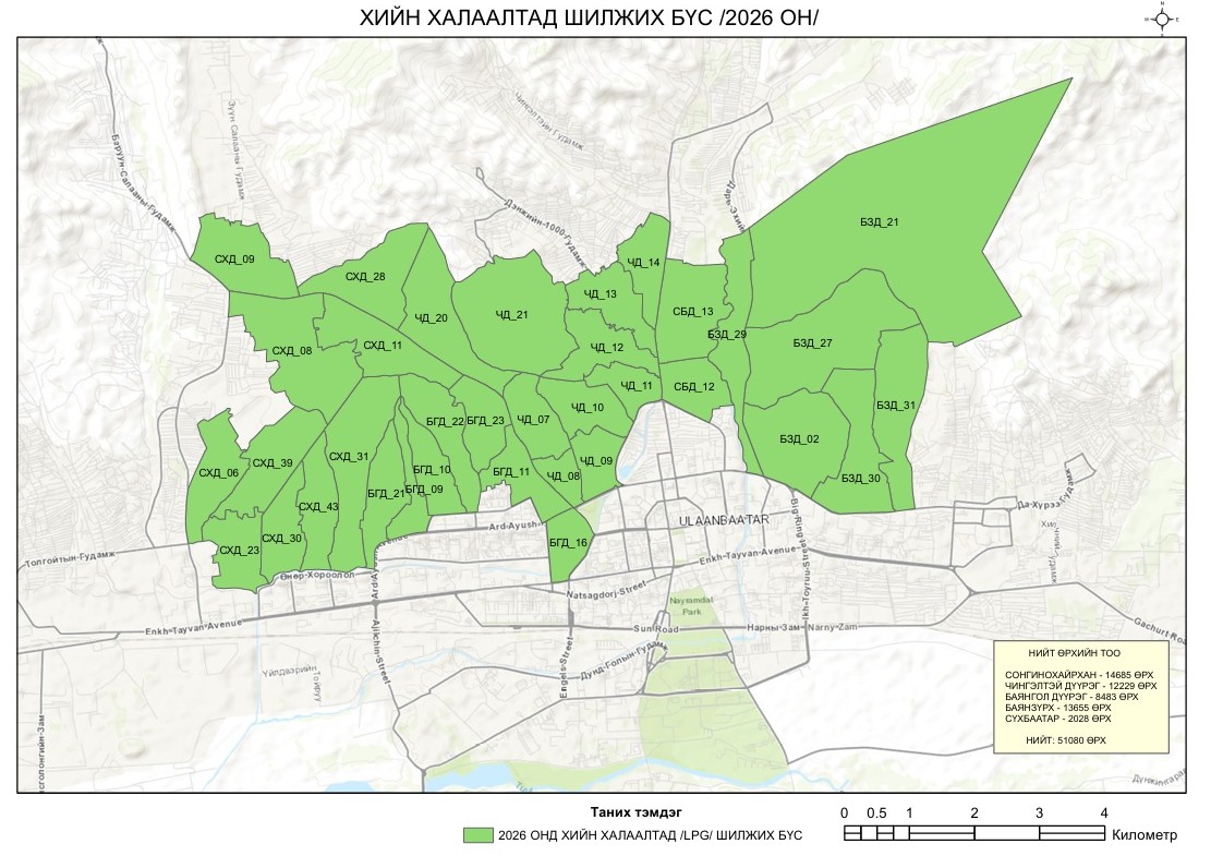 • Сүхбаатар дүүргийн 12, 13, 2 дугаар хорооны 2028 өрх, нийт 51080 өрхийг хийн халаалтад шилжүүлэх юм.