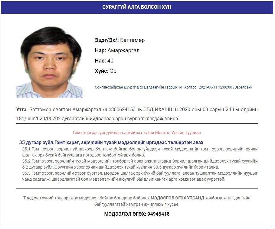 “Унагалдайн мухлаг” нэвтрүүлгийн хөтлөгч, сэтгүүлч Б.Амаржаргалыг жилийн турш ЦЕГ-аас эрэн сурвалжилж байгаа аж. Анх 2020 оны гуравдугаар сарын 24-ний өдрийн 181/шш2020/00702 дугаартай шийдвэрийн дагуу эрэн сурвалжилж байжээ. Харин энэ сарын 11-ний өдөр Сонгинохайрхан дүүргийн Цагдаагийн нэгдүгээр хэлтсээс дахин түүнийг эрэн сурвалжлахаар зарласан байна. Бүтэн жилийн турш ЦЕГ-аас өөрийг нь ямар үндэслэлээр эрэн сурвалжилж байгаа талаар Б.Амаржаргалаас тодрууллаа.