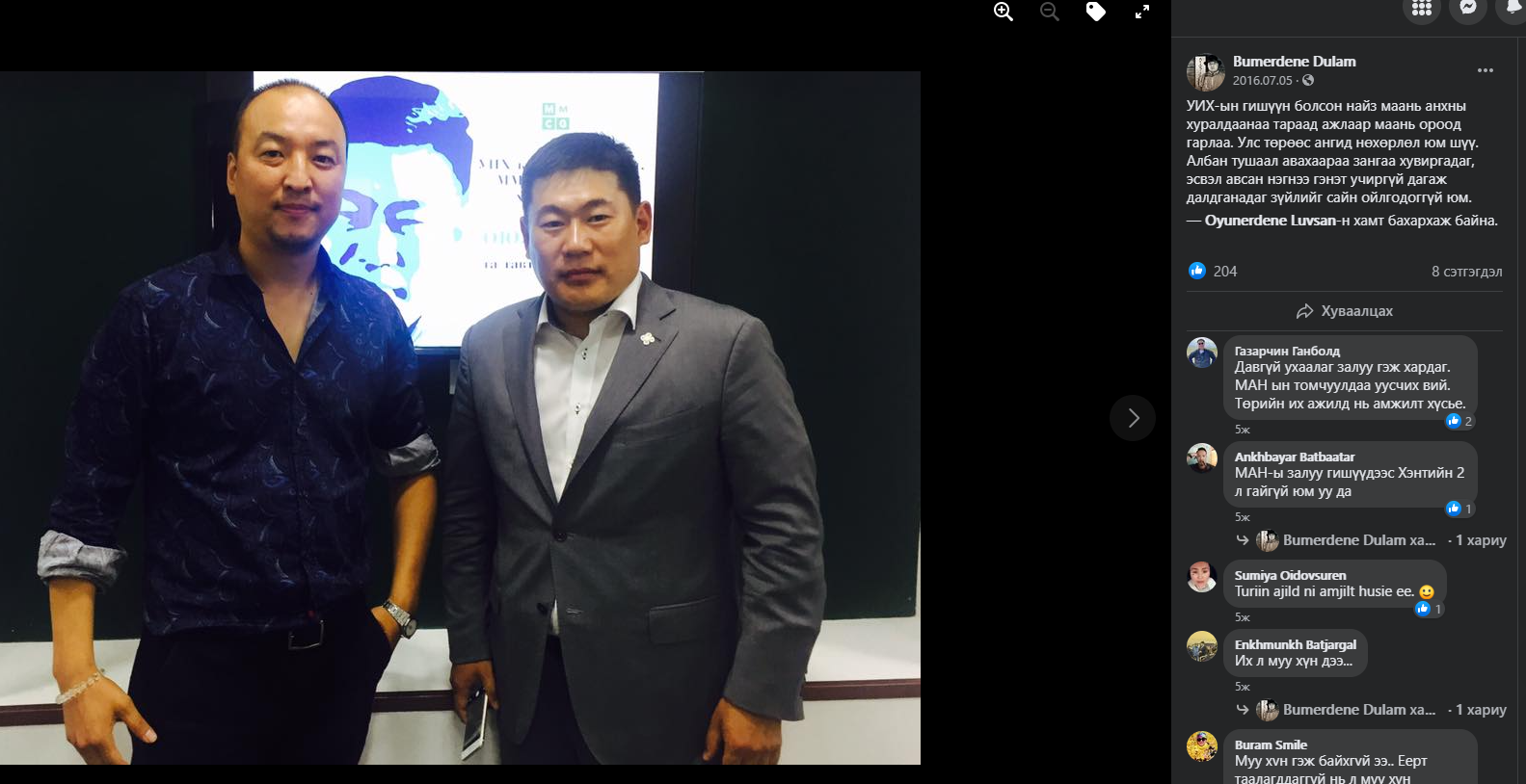 Тэгээд ч болоогүй, “Эм Эм Си Жи” ХХК-ийн захирал Д.Бум-Эрдэнэ өөрийгөө Ерөнхий сайд Л.Оюун-Эрдэнийн найз, Соёлын сайд Ч.Номингийн ажил хэргийн хамтрагч хэмээн ихэд бахархалтайгаар өөрийн цахим хуудастаа бичиж байжээ.