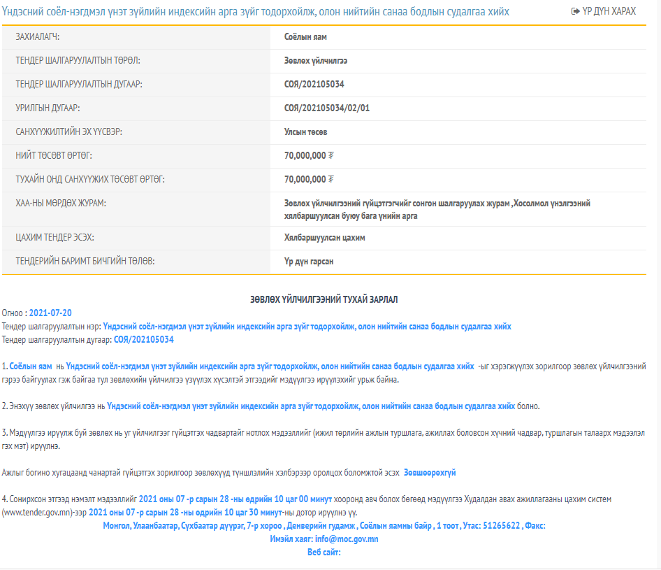 Тухайлбал, өнгөрсөн долдугаар сарын 20-нд “Үндэсний соёл-нэгдмэл үнэт зүйлийн индексийн арга зүйг тодорхойлж, олон нийтийн санаа бодлын судалгаа хийх” нэртэй улсын төсвийн 70 сая төгрөгийн санхүүжилттэй зөвлөх үйлчилгээний тендер зарласан байна. Мөн долдугаар сарын 30-нд дээрхтэй адил нэртэй, ижил өртөгтэй тендер зарлажээ.