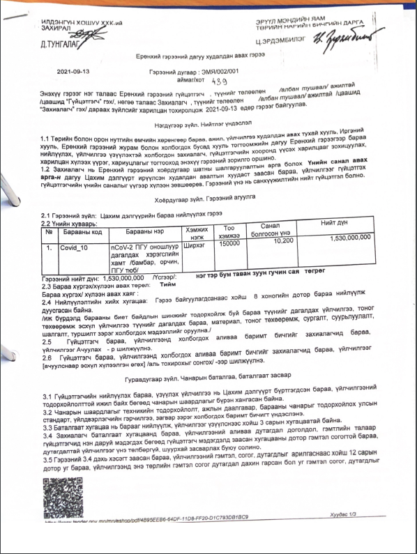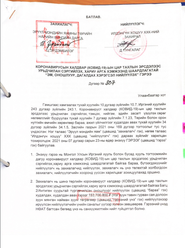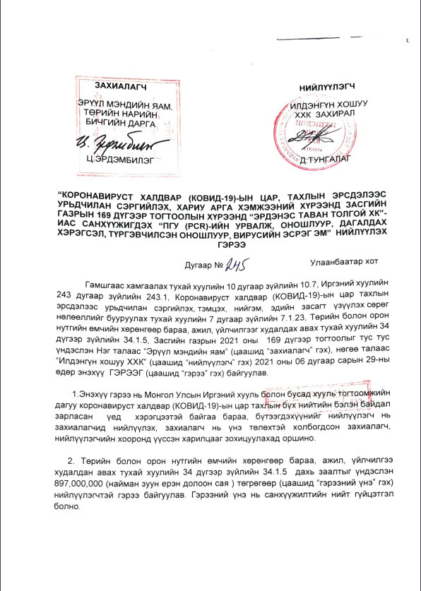 | “КОВИД-19” ТЕНДЕР: ХӨСҮТ-ийн зөвлөхийн “Илдэнгүн хошуу” ХХК оношлуур, дагалдах хэрэгсэл нийлүүлэх 4.1 тэрбум төгрөгийн тендерт шалгарчээ |