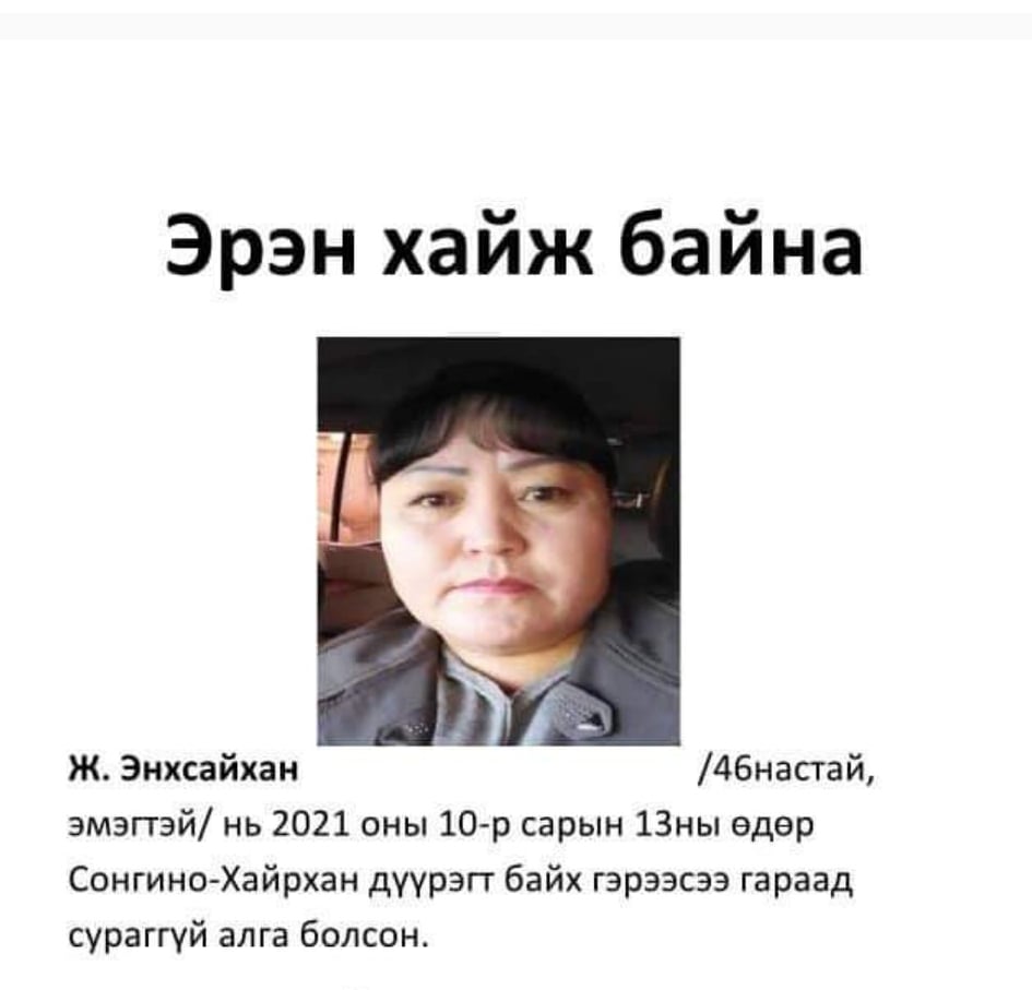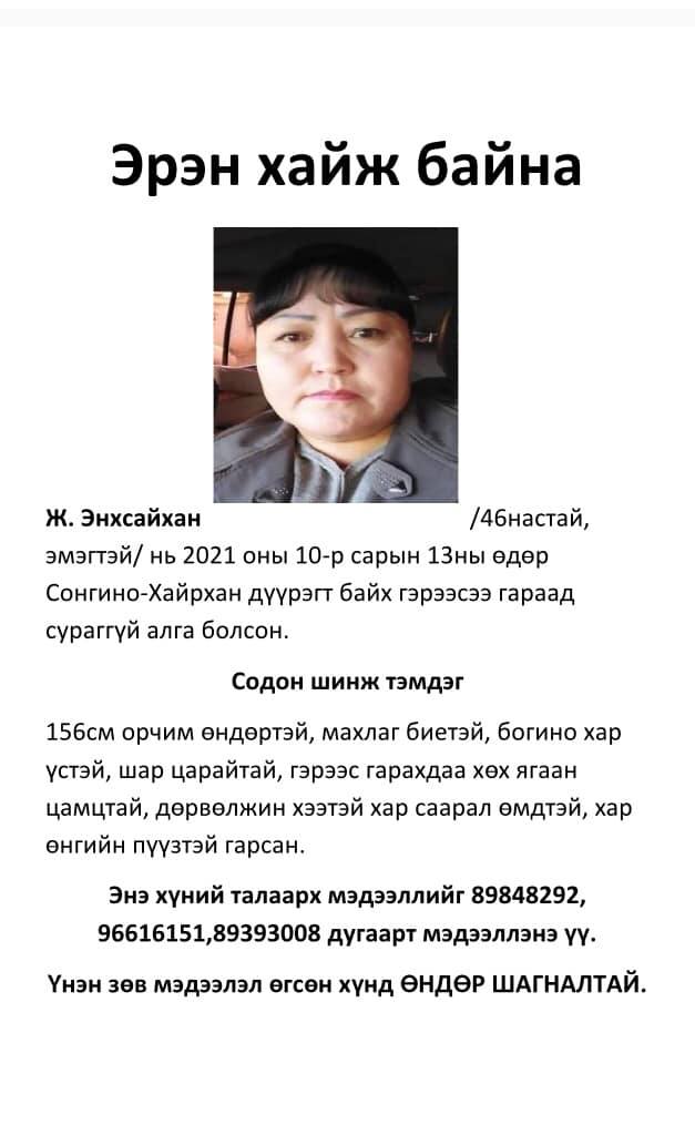 46 настай Ж.Энхсайхан гэх эмэгтэй аравдугаар сарын 13-нд гэр рүүгээ явахаар гараад сураггүй алга болжээ. Тэрбээр алга болоод 37 хонож байгаа бөгөөд энэ хугацаанд сураг нь гараагүй байна. Бид энэ талаар түүний хүү Э.Энхбаатартай холбогдож, тодрууллаа.