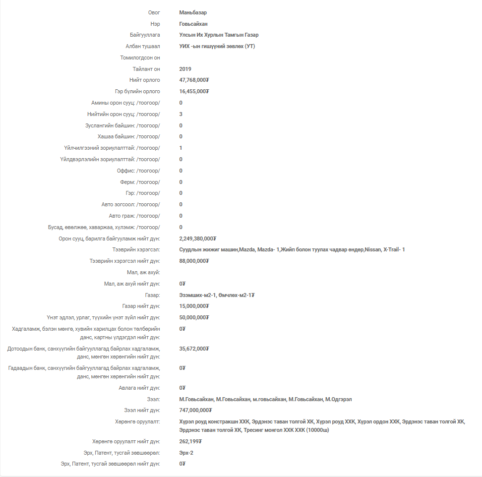 Тэрбээр 2020 оны ХОМ-тээ жилд 230 сая төгрөгийн орлоготой, 205 сая төгрөгийн орон сууцтай, 200 сая төгрөгийн Ланд-200 маркийн автомашинтай, Д.Сумъяабазарын Үндэсний хөрөнгө оруулалтын банк болон Голомт, ХХБ-нд 359 сая төгрөгийн зээлтэй гэж мэдүүлжээ. Хотын даргын хувийн банкнаас 300 сая төгрөгийн зээл аваад, орлогчоор нь томилогдоод, тэгээд болоогүй "давхар дээл" нөмөрнө гэдэг Д.Сумъяабазар, Н.Баярчимэг хоёр хэр ойр болохыг илтгэх биз ээ.