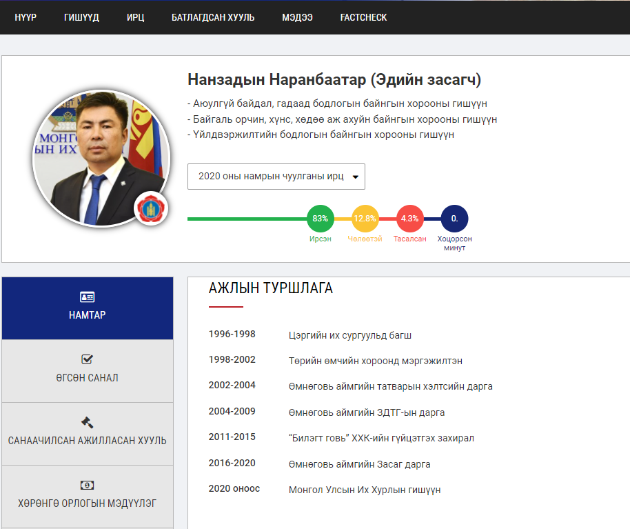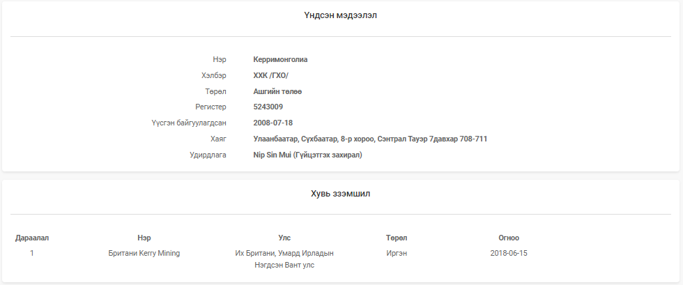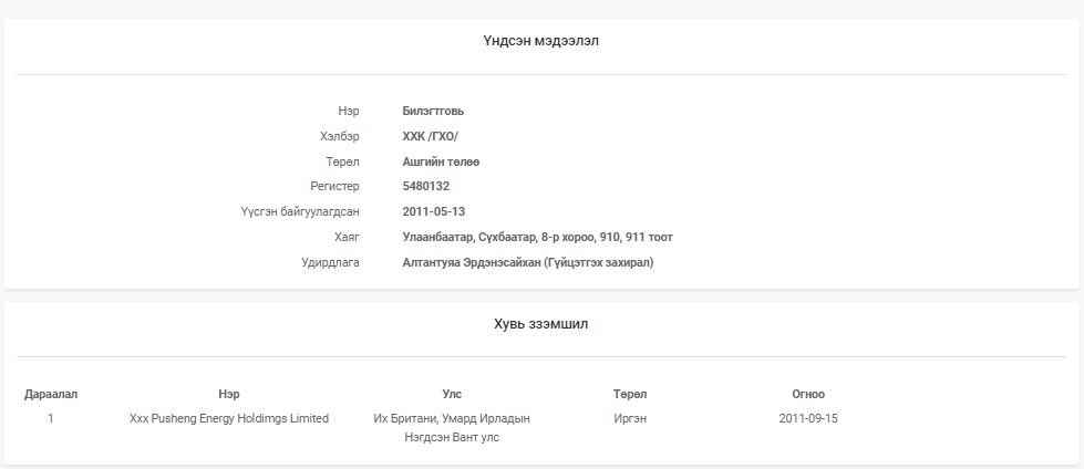 БАРИМТ 2: УИХ-ын гишүүн Н.Наранбаатар 2016 оны сонгуулийн дараа Өмнөговь аймгийн Засаг даргаар томилогдохынхоо өмнө буюу 2015 оныг хүртэл “Билэгт говь” ХХК-ийн захирлаар ажиллаж байсан. Энэ компанийг хүмүүс Дорноговь аймгийн Хөвсгөл суманд үйл ажиллагаа явуулдаг Айл баянгийн нүүрсний уурхайгаар нь мэднэ. Тэгвэл Н.Наранбаатарын захирлаар нь ажиллаж байсан “Билэгт говь” ХХК-ийн эцсийн эзэмшигчээр нь Их Британи, Умарт Ирландын нэгдсэн вант улсад бүртгэлтэй “Pusheng Energy Holdimgs Limited” компани бүртгэлтэй байдаг аж.