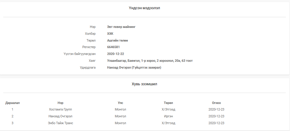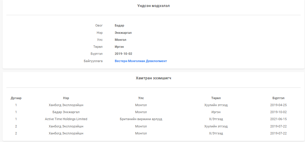 БАРИМТ 1: УИХ-ын гишүүн Нанзадын Наранбаатар, түүний дүү Нанзадын Очгэрэл нар “Сэрсэн говь”ХХК-ийг эзэмшдэг. Н.Наранбаатар өөрийнхөө ХОМ-т ч “Сэрсэн говь”ХХК-ийг дурддаг аж. Тэгвэл Н.Наранбаатарын дүү Н.Очгэрэл нь “Эвт повер майнинг” ХХК-д хувьцаа эзэмшдэг бөгөөд тус компанийн гүйцэтгэх захирлаар нь ажилладаг аж. Тэгвэл “Эвт повер майнинг” ХХК-ийг Н.Очгэрэлээс гадна “Хос тамга групп” ХХК, “Энбо тайж транс” ХХК-иуд эзэмшдэг юм байна. Цааш нь судлаад үзвэл, “Энбо тайж транс” ХХК нь Өмнөговь аймгийн Гурвантэс сумын нутагт Баян-Ундарга гэх нүүрсний уурхай ажиллуулдаг аж. Хамгийн ноцтой нь, “Энбо тайж транс” ХХК-ийн эцсийн өмчлөгч нь Их Британийн Виржини арлуудад бүртгэлтэй “Пүжин ложистик” компани ажээ.