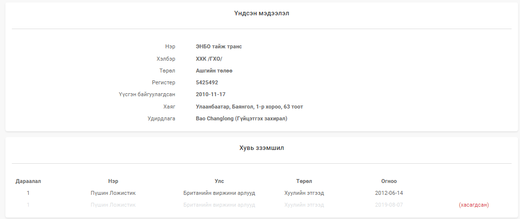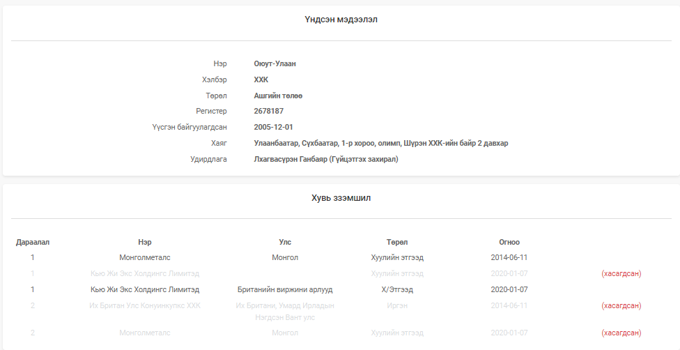 Харин Х.Мандахбаяр 2019 онд “Би “Их шижир баялаг” ХХК-иа зарсан” гэж мэдэгдсэнээс хойш тус компанийн гүйцэтгэх захирлаар Л.Лувсан-Эрдэнэ гэх хүн ажиллаж эхэлжээ. Улмаар “Их шижир баялаг” ХХК-ийн хувьцаа эзэмшигчээс Г.Номинчулууны “Суман говь” ХХК-ийг хасаж, харин “Хос цалиг” ХХК-ийг хувьцаа эзэмшигч хэвээр үлдээжээ. Ингэхдээ Х.Мандахбаяр “Хос цалиг” ХХК-ийн хувьцаа эзэмшигчээс өөрийнхөө болон А.Отгонбаярын нэрийг хасуулж, Б.Номин гэх эмэгтэйн эзэмшилд шилжүүлээд “Их шижир баялаг” ХХК-ийн хувьцаа эзэмшигчээр хэвээр үлдээсэн аж. “Тавантолгой” ХК-ийн хөрс хуулалтыг хийдэг гэх “Их шижир баялаг” ХХК-ийн хувьцаа эзэмшигчээр одоо ч “Хос цалиг” ХХК бүртгэлтэй хэвээр байна.
