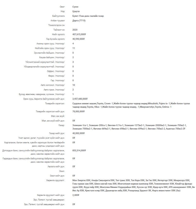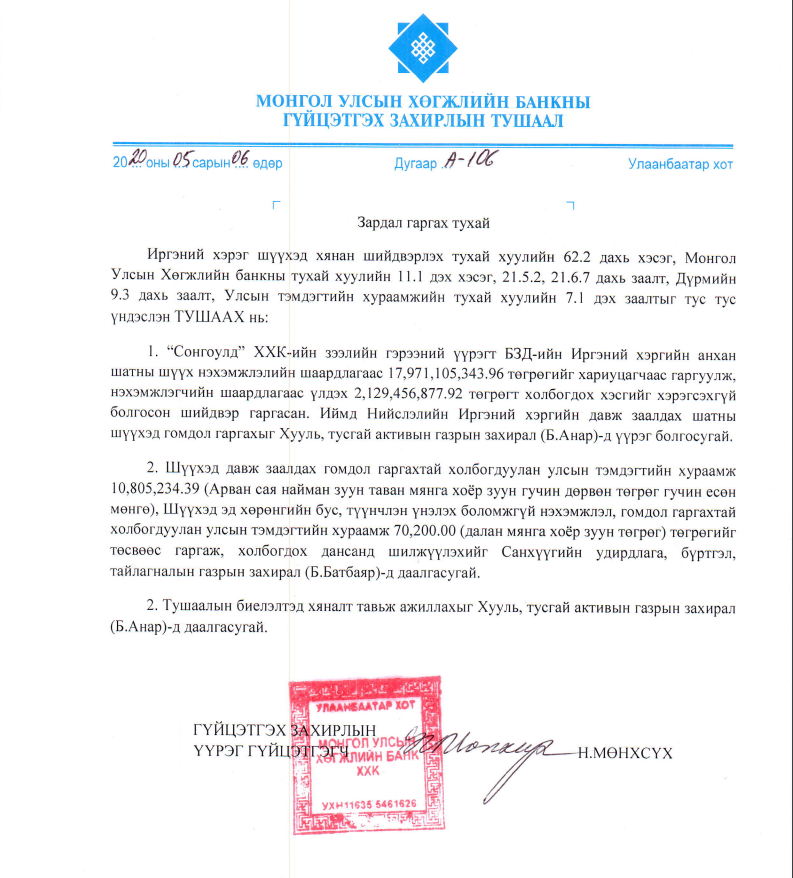 | ЭРГЭЛТИЙН ОНЦЛОХ НИЙТЛЭЛ: ДӨРВӨН ХАУС, 11 ОРОН СУУЦТАЙ ГААЛИЙН ДАРГА С.ЦЭЦГЭЭ ХӨГЖЛИЙН БАНКНЫ НАЙДВАРГҮЙ ЗЭЭЛДЭГЧИЙН АРД БАЙНА УУ |