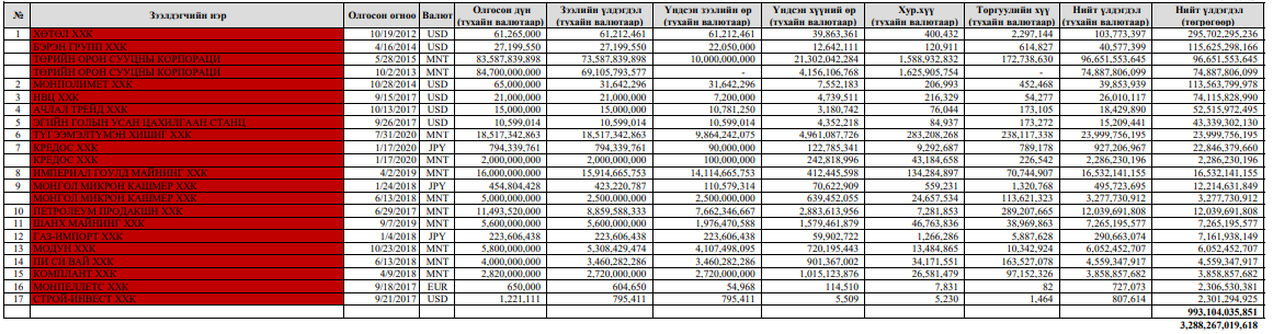 “Шанх майнинг” ХХК нь Хөгжлийн банкнаас 2019 оны есдүгээр сарын 7-нд 1.6 тэрбум төгрөг, 2019 оны есдүгээр сарын 24-нд 679 сая төгрөг төгрөг, 2019 оны аравдугаар сарын 22-нд 1.7 тэрбум төгрөг, 2019 оны арваннэгдүгээр сарын 29-нд 1.0 тэрбум төгрөг, 2020 оны нэгдүгээр сарын 17-нд 424 сая төгрөг тус тус зээлжээ. Өөрөөр хэлбэл, 2019-2020 оны хооронд таван удаагийн гүйлгээгээр 5.6 тэрбум төгрөг авсан байна. Гэвч зээлээ эргэн төлөөгүйгээс зээлийн хуримтлагдсан өр төлбөр нь нийлээд 7.2 тэрбум төгрөг хүрээд байна.