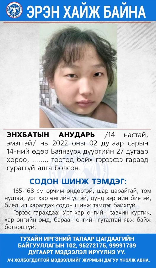 14 настай охин алга болсон тухай мэдээлэл цахим орчинд цацагдаад байна. Тодруулбал, ерөнхий боловсролын .. сургуулийн сурагч А нь хоёрдугаар сарын 14-нд хичээлдээ яваад сураггүй алга болжээ. Энэ талаар охины ээжээс тодрууллаа.