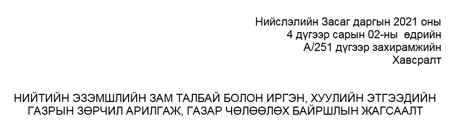 | Ц.АНАНДБАЗАРЫН ХОТЫН ТӨВИЙН ХУУЛЬ БУС ТӨЛБӨРТЭЙ ЗОГСООЛУУДЫН ХАШААГ НУРААЯ, ХОТЫН ДАРГА АА |