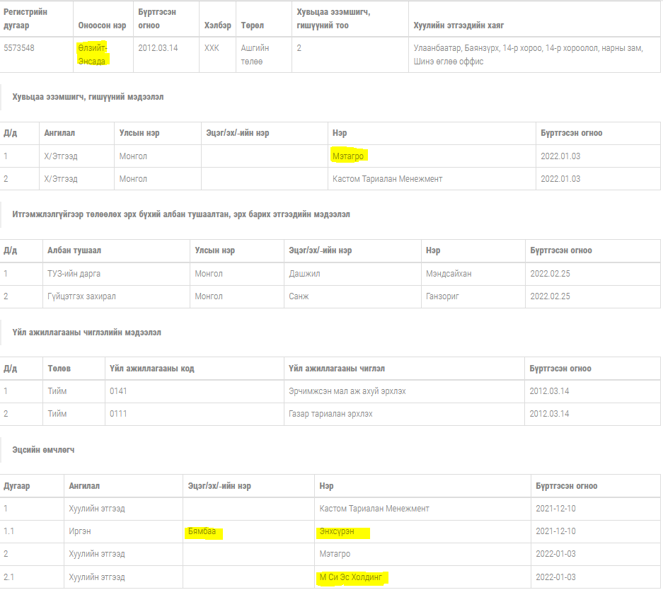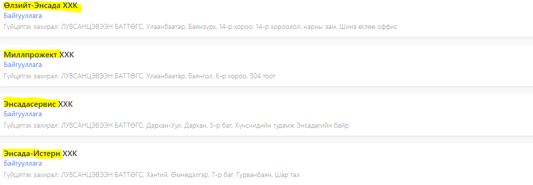 Гэхдээ өнгөрөгч хоёрдугаар сард буюу Хөгжлийн банкны найдваргүй зээлдэгчдийн асуудал ид дэгдэж байх үед “Өлзийт Энсада” ХХК-ийн гүйцэтгэх захирлыг нь Санжийн Ганзоригоор сольсон. Өдгөө “Өлзийт-Энсада” ХХК-ийн гүйцэтгэх захирлаар Санжийн Ганзориг, эцсийн өмчлөгчөөр нь Бямбаагийн Энхсүрэн, “Кастом тариалан менежмент” ХХК, "М Си Эс" группийн охин компаниуд болох “Мэт агро” ХХК, “М Си Эс Холдинг” ХХК-иуд бүртгэлтэй байна. Гэхдээ гүйцэтгэх захирал нь солигдлоо гээд “Энсада Истерн” ХХК, “Өлзийт Энсада” ХХК-иуд хоорондоо хамааралгүй болчихоогүй. Учир нь толгой компаниуд болох “Энсада холдинг” ХХК, “Энсада сервис”-иудыг “Өлзийт Энсада” ХХК-ийн эцсийн өмчлөгч Б.Энхсүрэн эзэмшдэг хэвээрээ байгаа юм.