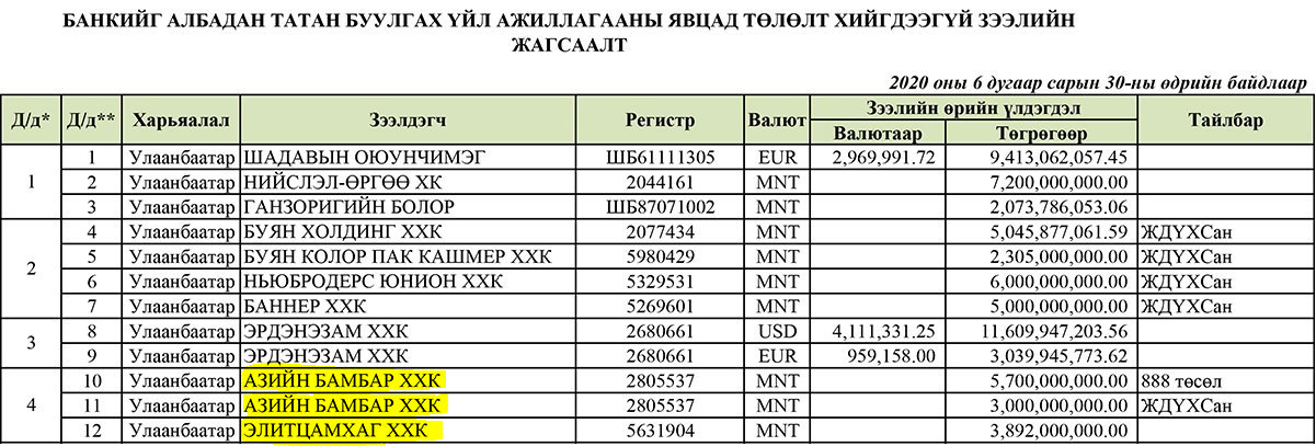 ТАЙЛБАР: КАПИТАЛ БАНКНЫ ЗЭЭЛДЭГЧДИЙН ЖАГСААЛ- Г.АЮУЛГҮЙН "АЗИЙН БАМБАР" ХХК, "ЭЛИТ ЦАМХАГ" ХХК