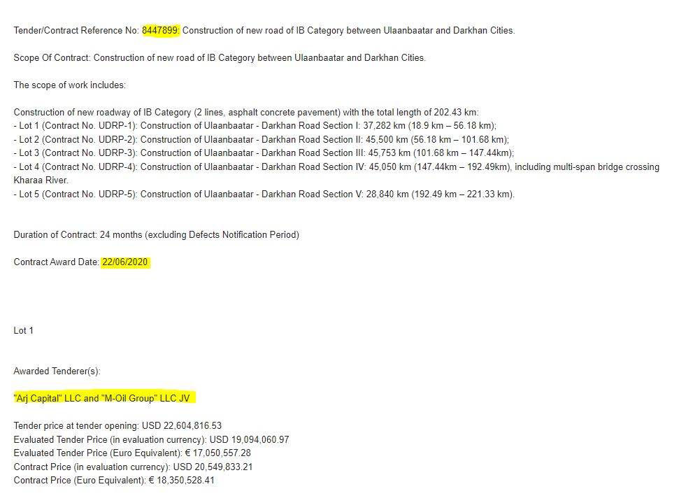 Тэгвэл Д.Ганбаатарын “Арж капитал” ХХК нь Дарханы замын тендерт шалгарсан нь Зам, тээврийн хөгжлийн сайд асан Б.Энх-Амгалантай хэрхэн холбогдох вэ. Европын сэргээн босголт хөгжлийн банкны албан ёсны цахим хуудаснаас хайж үзвэл, Дархан-Улаанбаатар чиглэлийн 204 км хатуу хучилттай автозамын I-V багцын тендерт шалгарсан аж ахуйн нэгжүүдтэй 2020 оны зургадугаар сарын 22-ны өдөр 24 сарын хугацаатай гэрээ байгуулсан тухайгаа нийтэлж байжээ. Тухайн тайланд бичсэнээр Дарханы замын I багцад “Арж капитал” ХХК шалгарсан учир 20.5 сая ам.доллар буюу өнөөдрийн ханшаар 65 тэрбум төгрөгийн гэрээ байгуулсан гэж дурдсан байна.