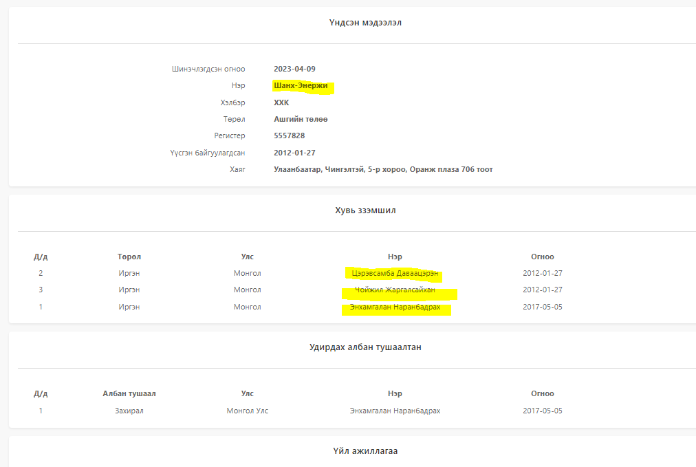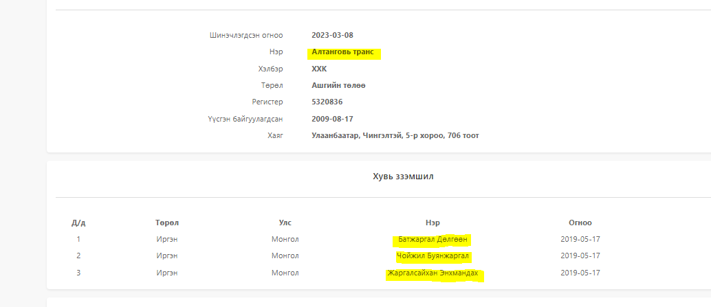 “Гурвансайхан интернэйшнл” ХХК-ийг 2008 онд Төлбөр эсвэл гэрээний үндсэн дээр хийгдэх бөөний худалдаа, гадаад худалдааны чиглэлээр Улаанбаатар, Хан-Уул, 15-р хороо, Гэгээнтэн оффис 1001 тоотод бүртгүүлж, зөвшөөрөл авч байжээ. Хувьцаа эзэмшигчид нь Цэрэвсамбын Даваацэрэн, Чойжилийн Жаргалсайхан, Батжаргал, Буянжаргал нар бүртгүүлж байжээ. Харин гүйцэтгэх захирлаар нь Жаргалсайханы охин Уянга ажилладаг.