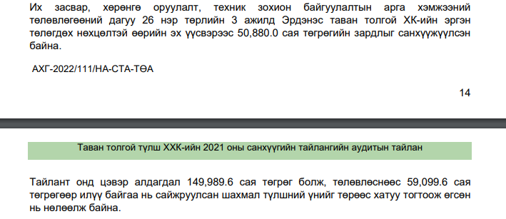Нүүрсний хулгайн жимээр орж, “Тавантолгой түлш” ХХК-ийн 2018-2022 он хүртэлх санхүүгийн тайланд аудитын шалгалт оруулж эхэлсэн талаар эх сурвалж мэдээллээ. Эх сурвалжийн бидэнд өгсөн мэдээллээр “Тавантолгой түлш” ХХК-ийн удирдлагын багийнхан сандралдаж эхэлсэн гэнэ. Тус компанид эрх бүхий алба хашиж байсан хүмүүсийг толгой дараалан дуудаж, мэдүүлэг авах ажиллагаа эхэлсэн юм шиг байна лээ. Нэг нэг рүүгээ чихээд хөгөө чирч байгаа сурагтай. Хэний тушаалаар, хэн гарын үсэг зурсан, хахуулийн мөнгөнөөс хэн ашиг хүртсэн гээд нэгдсэн шалгалт болох нь. Хөгжлийн банкны зээлдэгчийн хэргээс ч хөгтэй “юм” болох нь. “Чиний шахалтаар гарын үсэг зурсан. Хуурамчаар санхүүгийн бичиг үйлдсэн. Ашигтай ажилласныг зохион байгуулалттайгаар алдагдалтай болгосон” гээд л том асуудлууд эхэлж байгаа” гэлээ.