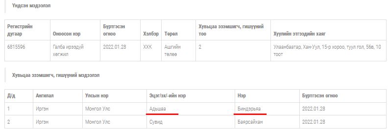 УИХ-ын гишүүн Ш.Адьшаагийн том хүү Биндэрьяа Канадын Торонтогийн Их сургуульд Физикч мэргэжлээр суралцахаар 101,967 ам.долларын зээл авсан. Ш.Адьшаагийн хүү А.Биндэрьяа Торонтогийн их сургуулийг төгсөж ирээд, 2021 оны зургадугаар сард УИХ-ын гишүүн О.Цогтгэрэлийн хүү Ганзориг, О.Цогтгэрэлийн төрсөн ах “Тэсо” группийн ТУЗ-ийн дарга О.Дамжингийн хүү Ганбаяр нартай хамтран “ИКВ сөрвэй” ХХК-ийг үүсгэн байгуулсан. Мөн Дамжингийн Ганбаяр нь Ш.Адьшаагийн бага хүү А.Алтансүхтэй “Голдэн эйж юнайтед” ХХК-ийг хамтран эзэмшдэг. Товчхондоо, Ш.Адьшаа, О.Цогтгэрэл нар Төрийн ордонд тохой нийлүүлэн сууж, харин хөвгүүд нь хамтран бизнес хийж байна гэсэн үг.