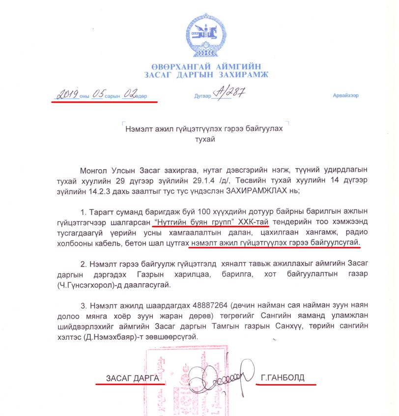| "НУТГИЙН БУЯН ГРУПП" ХХК-ИЙН ЗАХИРАЛ Л.БАТ-ОРШИХ УИХ-ЫН Г.ГАНБОЛД, Л.ЭНХ-АМГАЛАН НАРЫН СОНГУУЛИЙН САНХҮҮЖИЛТИЙГ БАРИЛГААР БОСГОДОГ УУ |