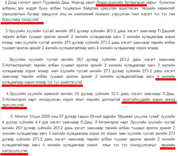 Гэтэл П.Даш, Л.Алтангэрэл нар “Хэргээ цагаатгуулж, нэр төрөө сэргээлгэнэ” гэж давж заалдах шатны шүүхэд хандсан. Харин давж заалдах шатны шүүх тэдний хэргийг эхнээс нь дахин хянуулахаар Чингэлтэй дүүргийн шүүхэд шилжүүлсэн. Ийнхүү үргэлжилж явсаар 2012 онд Чингэлтэй дүүргийн шүүх П.Даш, Л.Алтангэрэл нарт 3.6 жилийн хорих ял оноож, Улсын дээд шүүх ч тэдний 3.6 жилийн хорих ялыг хэвээр үлдээсэн. Ингээд тэд хорих анги руу ачигдсан байдаг. Товчхондоо, Л.Алтангэрэлийг авлига, албан тушаалын хэрэгтэн гэдгийг эхлээд Хан-Уул дүүргийн шүүх тогтоосон ч хорих ялаас нь өршөөсөн. Гэтэл өршөөгдсөндөө ханаагүй Л.Алтангэрэл хэргээ цагаатгуулах гэж шүүхдээд дахин 3.6 жилийн ял сонсож, улмаар хорих ялаа эдлэхээс өөр сонголтгүй болсон байдаг.