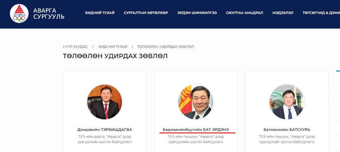 Ж.ХАТАНБААТАРТАЙ “МОНГОЛЫН ҮНДЭСНИЙ ДОПИНГИЙН ЭСРЭГ БАЙГУУЛЛАГА” ТББ-ЫГ ХАМТРАН ЭЗЭМШДЭГ Г.СҮХБАТ НЬ СПОРТЫН САЙД Б.БАТ-ЭРДЭНИЙН “АВАРГА” СУРГУУЛИЙН ТЭРГҮҮН ДЭД ЗАХИРЛААР АЖИЛЛАДАГ