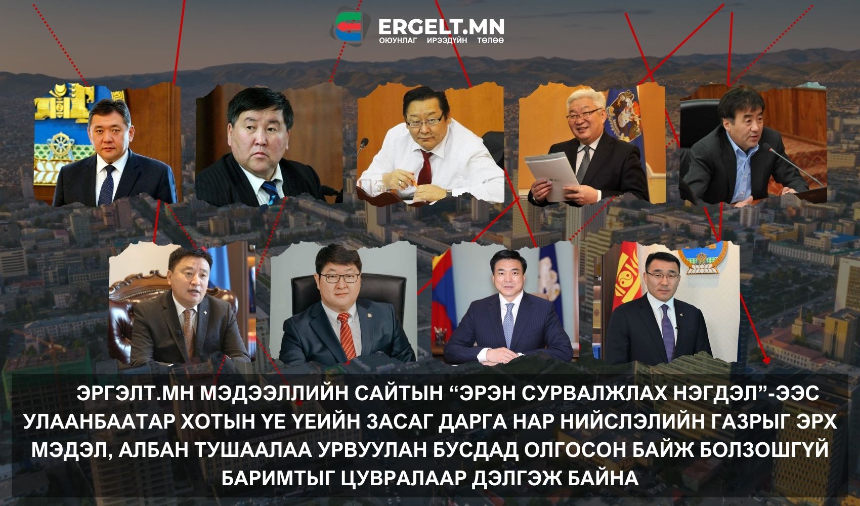 ЭРГЭЛТ.МН МЭДЭЭЛЛИЙН САЙТЫН “ЭРЭН СУРВАЛЖЛАХ НЭГДЭЛ”-ЭЭС 1999 ОНООС ХОЙШИХ УЛААНБААТАР ХОТЫН ҮЕ ҮЕИЙН ЗАСАГ ДАРГА НАР НИЙСЛЭЛИЙН ГАЗРЫГ ЭРХ МЭДЭЛ, АЛБАН ТУШААЛАА УРВУУЛАН ӨӨРСДИЙНХӨӨ ХАМААРАЛ БҮХИЙ ЭТГЭЭДҮҮДЭД БОЛОН БУСДАД ХУУЛЬ БУСААР ОЛГОСОН БАЙЖ БОЛЗОШГҮЙ БАРИМТЫГ ЦУВРАЛААР ДЭЛГЭЖ БАЙНА.
