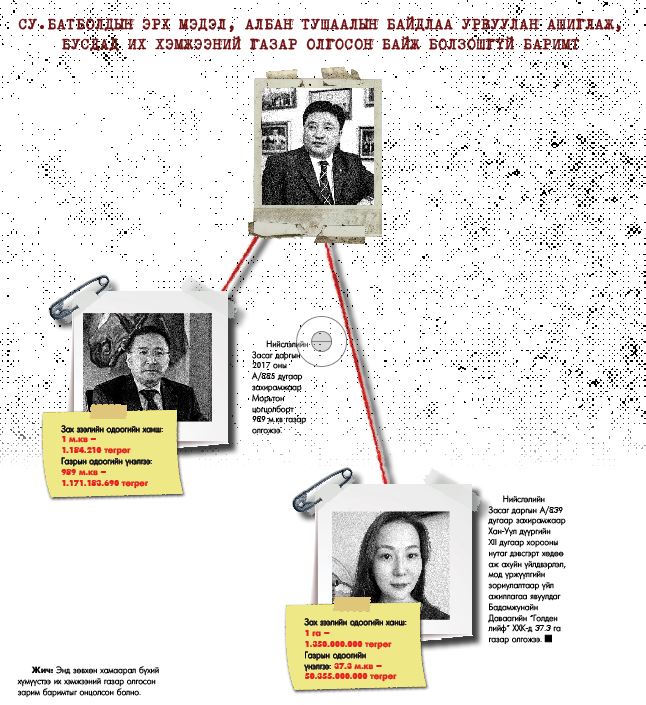 Харин үлдсэн 16 га газраас Су.Батболд өөрийн шадар туслах Энхболдын Анарт 2.2 га, том хүү Б.Төрболдынхоо эхнэр Батцэнгэлийн Оюун-Эрдэнэд 2.2 га газар тус тус олгожээ. Өөрөөр хэлбэл, Су.Батболд “Макс групп”-ийн эзэн Д.Ганбаатарын цуцлагдсан 70 га газрын 54 га-г нь дахин олгож өгснийхөө хариуд 4.4 га газрыг нь хувьдаа аваад үлдчихсэн гэсэн үг.