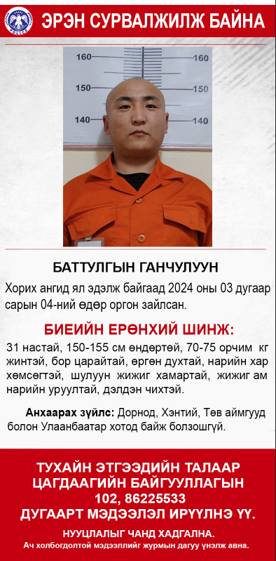 Тэгвэл эрэн сурвалжлагдаж байгаа хоригдол Б.Ганчулуун нь 31 настай, 150-155 см өндөртэй, 70-75 кг жинтэй, бор царайтай, өргөн духтай, нарийн хар хөмсөгтэй, шулуун жижиг хамартай, жижиг, нарийн уруултай, дэлдэн чихтэй этгээд ажээ. Зугтсан газар нь Улаанбаатар, Хэнтий, Дорнод, Төв аймагт байж болзошгүй гэнэ.
