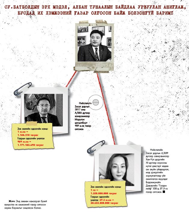 Тэгвэл Су.Батболд Хотын дарга байхдаа хууль бусаар газар зарж, хүүгийнхээ нэр дээрх ББСБ-ыг хөл дээр нь босгож, боловсноор угаасан байж болзошгүй маш ноцтой баримтыг танилцуулъя.