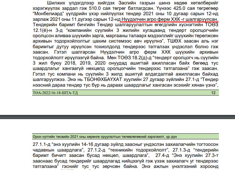 Тайлбар: "Нүүдэлчин агро ферм" ХХК-ийг хууль бусаар тендерт шалгаруулсныг тогтоосон аудитын газрын дүгнэлт