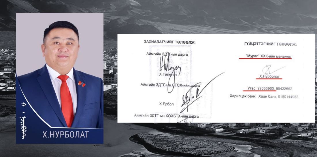 Баян-Өлгий аймгийн ИТХ-ын төлөөлөгч Халиасхарын Нурболатын аав Хызырын Халиасхар нь “Мурап” ХХК-ийг эзэмшдэг. “Мурап” ХХК нь Баян-Өлгий аймгийн сургууль, цэцэрлэгийн барилгын бүх том төсөвтэй тендерүүдэд торох юмгүй шалгардаг. Учир нь “Мурап” ХХК-ийн жинхэнэ эзэн нь ИТХ-ын төлөөлөгч Х.Нурболат. Тодруулбал, “Мурап” ХХК нь тендер авах бүрд Х.Нурболат өөрөө гэрээ байгуулдаг бөгөөд “Мурап” ХХК-ийн менежер гэж гарын үсэг зурдаг ажээ. Өөрөөр хэлбэл, “Мурап” ХХК нь настай аав Х.Халиасарынх нь дээр байдаг ч тендер авах, гэрээ байгуулах бүх ажлыг Х.Нурболат өөрөө хариуцдаг гэсэн үг.